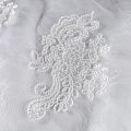 Кружевное полотно на сетчатой жаккардовой основе оттенка молочного жемчуга с флористическим узором. Тонкое, легкое, очень мягкое и пластичное, хорошо драпируется, приятное тактильно. Вышивка оформлена кордовой нитью. С обеих сторон ткань украшена симметричными фестонами, что придает полотну законченный и нарядный вид. Великолепно будет смотреться в нарядном вечернем, свадебном платье, платье на выпускной бал, в юбках, блузках, топах. Также можно применять отдельные элементы для декора, которые вырезаются из полотна.