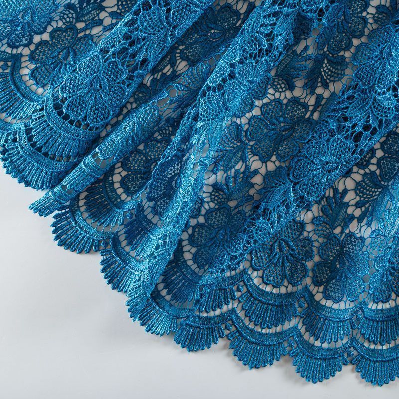 Гипюр-макраме представляет собой ажурное полотно, имеющее рельефную текстуру с цветочным ажурным плетением по всей ширине и фестонами по обе стороны кромок. Материал прозрачный на теле и на просвет, требуется подклад. Всегда актуален при создании утончённых и роскошных нарядов, придавая им дороговизны и оригинальности. Может использоваться для пошива платьев, костюмов прямого кроя, изготовления декоративных элеметов. Набирается на изделие объемом.