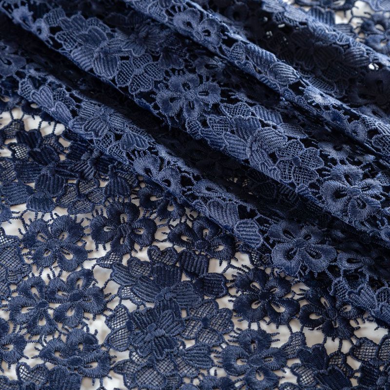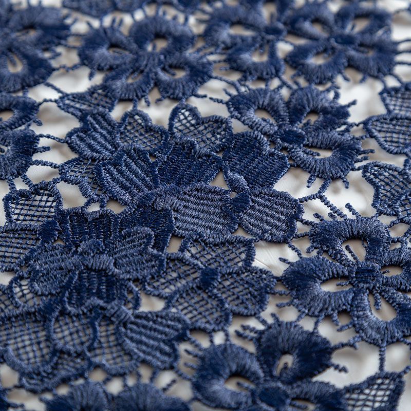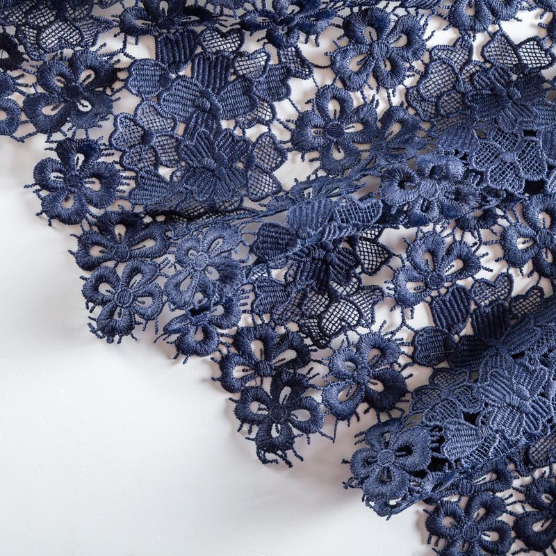 Гипюр-макраме представляет собой ажурное полотно, имеющее рельефную текстуру с цветочным ажурным плетением по всей ширине и фестонами по обе стороны кромок. Материал прозрачный на теле и на просвет, требуется подклад. Всегда актуален при создании утончённых и роскошных нарядов, придавая им дороговизны и оригинальности. Может использоваться для пошива платьев, костюмов прямого кроя, изготовления декоративных элеметов. Набирается на изделие объемом.