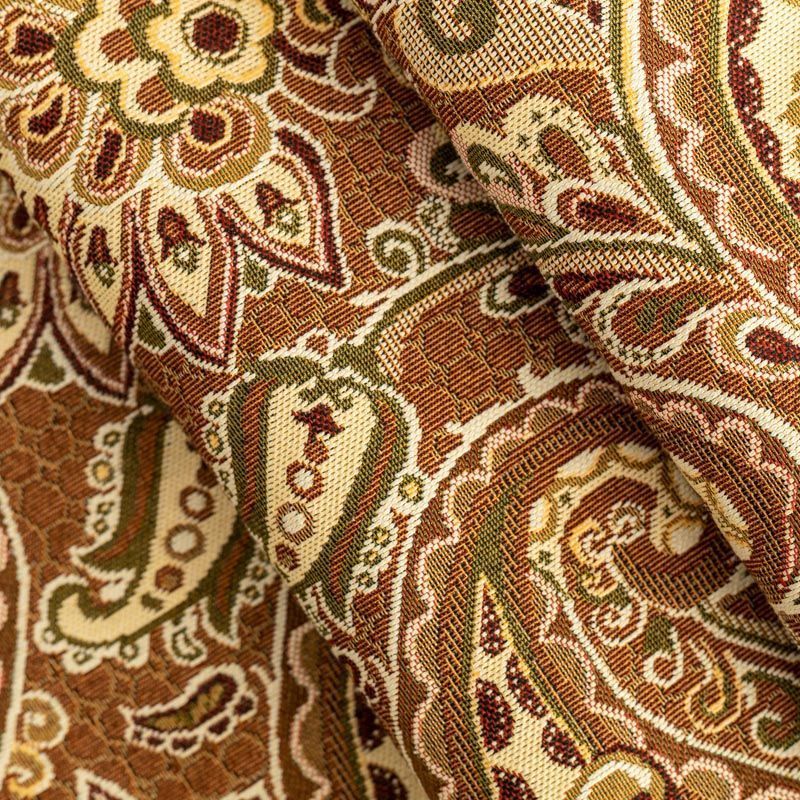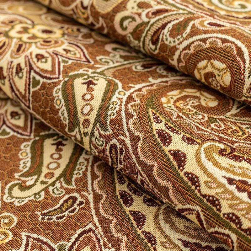 Гобелен представляет собой ткань, выполненную перекрестным плетением нитей с одномоментным созданием сюжетной или орнаментальной композиции. Это плотный материал высокую прочность и износостойкость. Гобелен используют для пошива плотных светонепроницаемых штор, декоративного домашнего текстиля и аксессуаров, в мебельном производстве для обивки мебели. Так же применяется в рукоделии: модные кошельки, сумочки, пояса и другие аксессуары и при изготовлении дизайнерской одежды. На коричнево-песочном фоне растительный цветной узор в стиле пейсли.