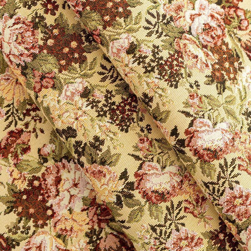 Гобелен представляет собой ткань, выполненную  перекрестным плетением нитей с одномоментным созданием сюжетной или орнаментальной композиции. Это плотный материал высокую прочность и износостойкость. Гобелен используют для пошива плотных светонепроницаемых штор, декоративного домашнего текстиля и аксессуаров, в мебельном производстве для обивки мебели. Так же применяется в рукоделии: модные кошельки, сумочки, пояса и другие аксессуары и при изготовлении дизайнерской одежды. Очень летний принт - букеты из садовых и полевых цветов на спокойном фоне натурального песочного оттенка.