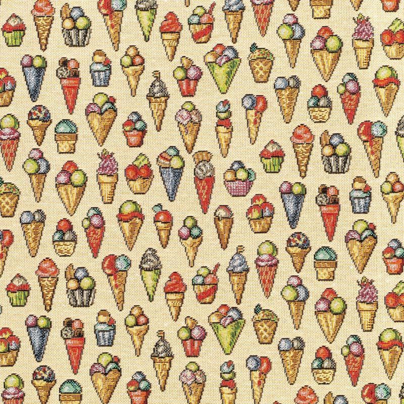 Гобелен представляет собой ткань, выполненную  перекрестным плетением нитей с одномоментным созданием сюжетной или орнаментальной композиции. Это плотный материал высокую прочность и износостойкость. Гобелен используют для пошива плотных светонепроницаемых штор, декоративного домашнего текстиля и аксессуаров, в мебельном производстве для обивки мебели. Так же применяется в рукоделии: модные кошельки, сумочки, пояса и другие аксессуары и при изготовлении дизайнерской одежды. На спокойном песочно-бежевом фоне цветное разнообразие рожков и корзиночек с мороженым.