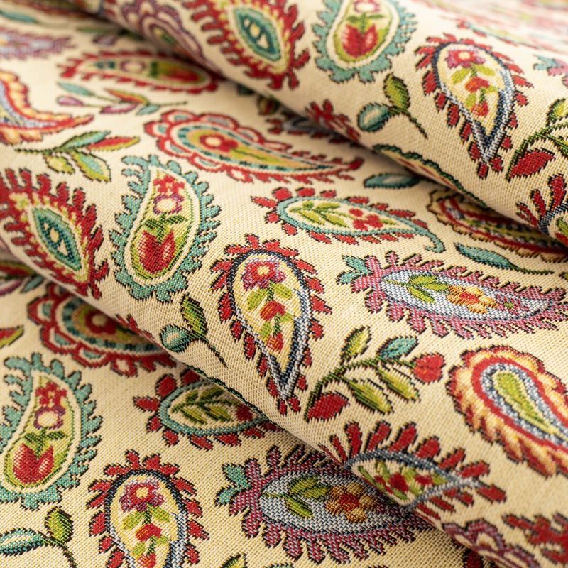 Гобелен представляет собой ткань, выполненную перекрестным плетением нитей с одномоментным созданием сюжетной или орнаментальной композиции. Это плотный материал высокую прочность и износостойкость. Гобелен используют для пошива плотных светонепроницаемых штор, декоративного домашнего текстиля и аксессуаров, в мебельном производстве для обивки мебели. Так же применяется в рукоделии: модные кошельки, сумочки, пояса и другие аксессуары и при изготовлении дизайнерской одежды. На спокойном песочно-бежевом фоне растительный цветной узор в стиле пейсли.