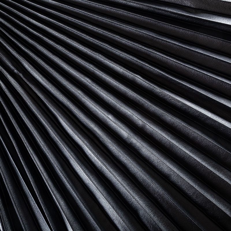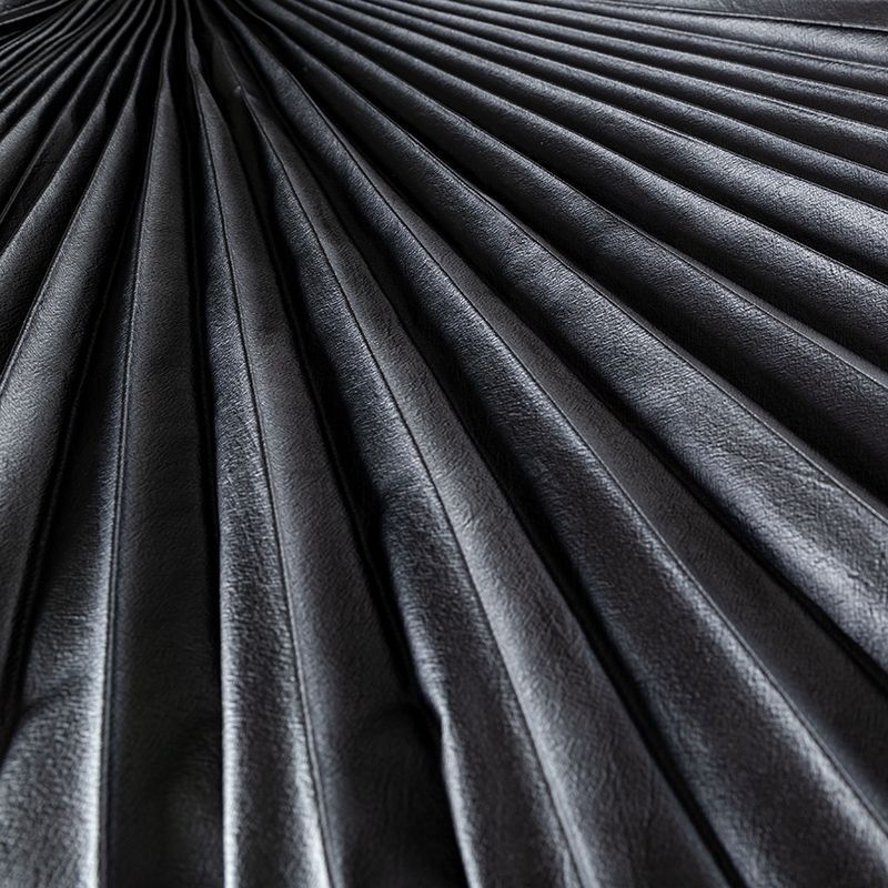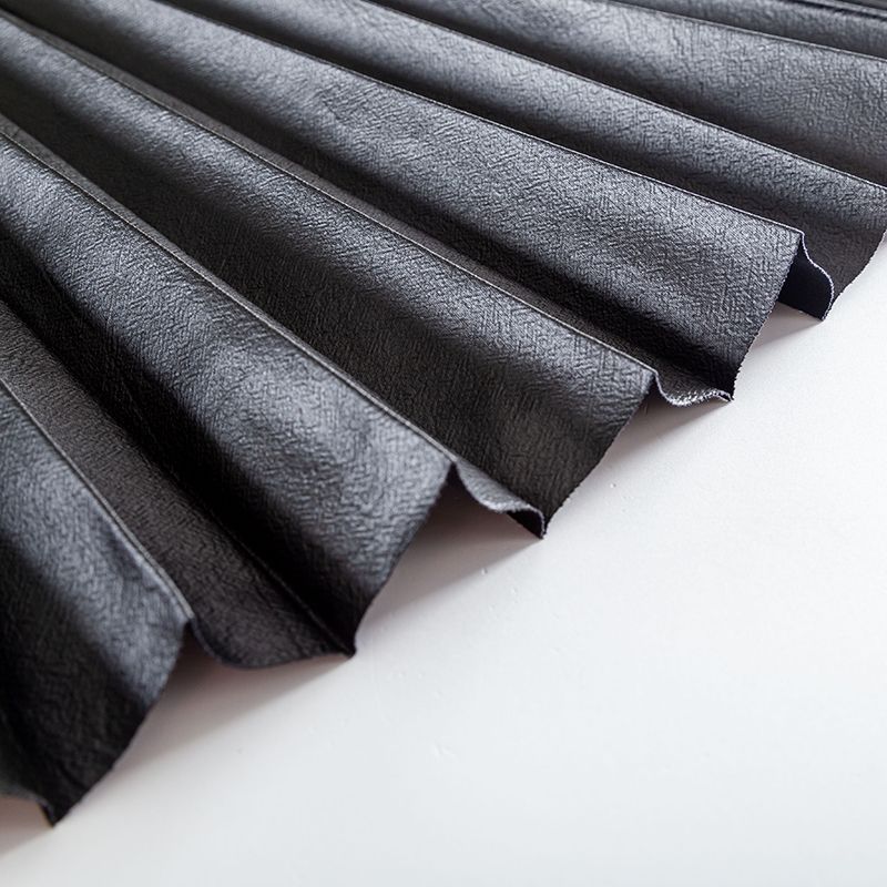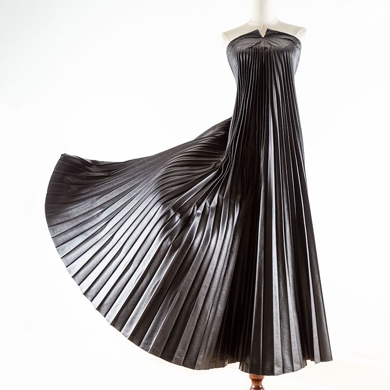 Готовый гофрированный купон из черной экокожи на вискозной основе для пошива шикарной юбки или платья. Объем по низу 420 см, по талии 50 см, длина 120 см. Ткань раскроена полусолнцем, гофре заложено сверху вниз на увеличение. Можно использовать для клиновидной вставки в другую юбку, в спинку или рукав.
