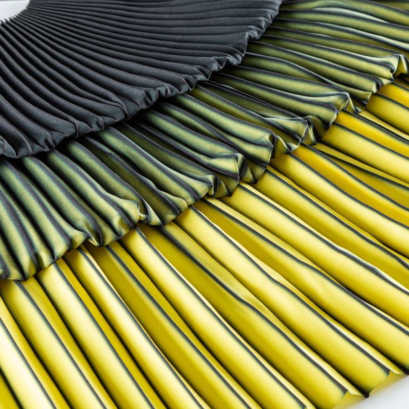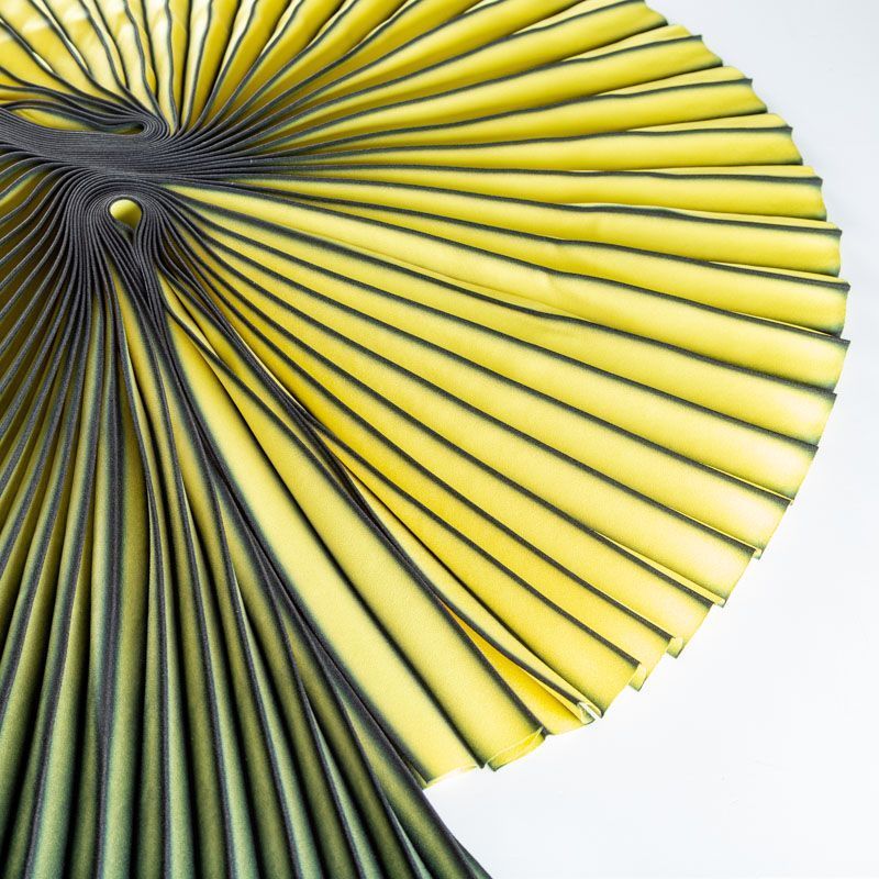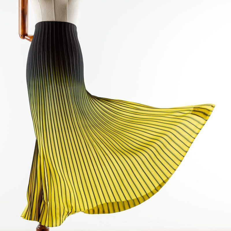Готовый гофрированный купон из матовой креповой ткани выполнен в технике градиент от черного к желтому оттенку. Объем по низу 180 см, по талии 60 см, длина 110 см. Ткань раскроена полусолнцем, гофре заложено сверху вниз на увеличение. Ребро складки выделено черным цветом. Гофре визуально вытягивает и стройнит фигуру, именно поэтому уже который год юбки и платья гофре находятся в числе топовых вещей женского гардероба в классическом исполнении – миди и в пол, или в оригинальном ассиметричном крое. Можно использовать для клиновидной вставки в другую юбку, в спинку или рукав.