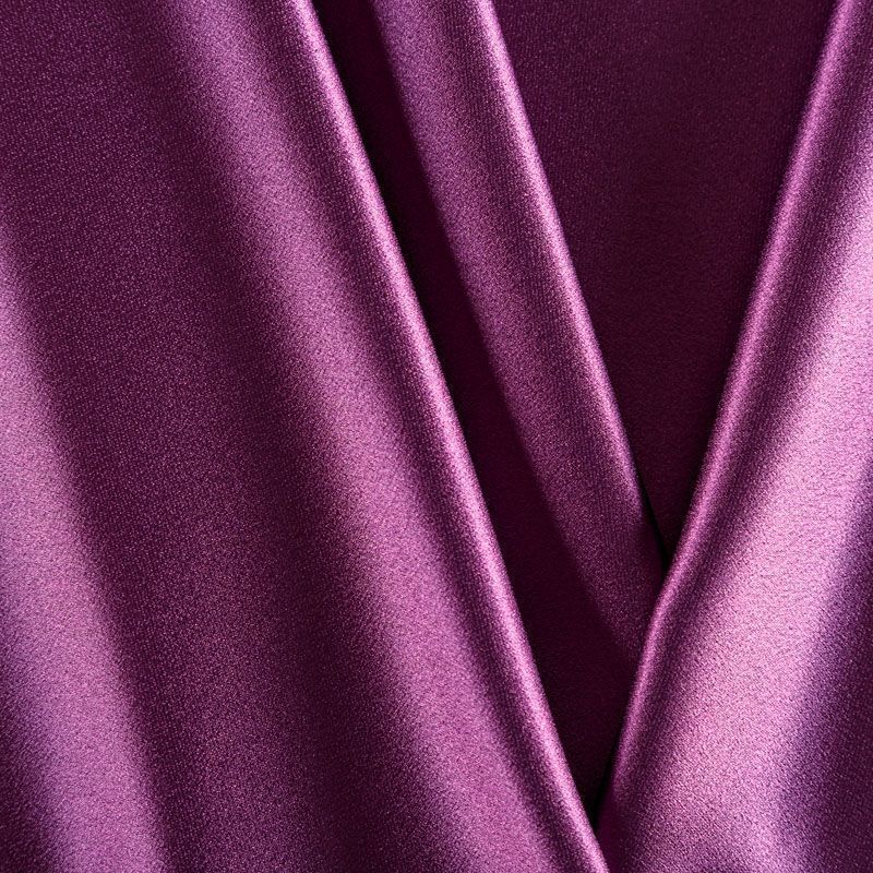 Итальянская ткань кади сливового оттенка. Кади — это креп-атлас с красивым глянцевым блеском. Ткань с плотной фактурой, роскошно ниспадает, очень хорошо тянется, изумительно садится по фигуре и шикарно смотрится в изделии. Она хорошо драпируется, эффектно облегает. Подходит для пошива удлиненных платьев с драпировками, платья-футляра, брюк палаццо, юбки-карандаш, жакета, туники, кроп-топа, а также для вечерних, свадебных и  выпускных платьев и костюмов.