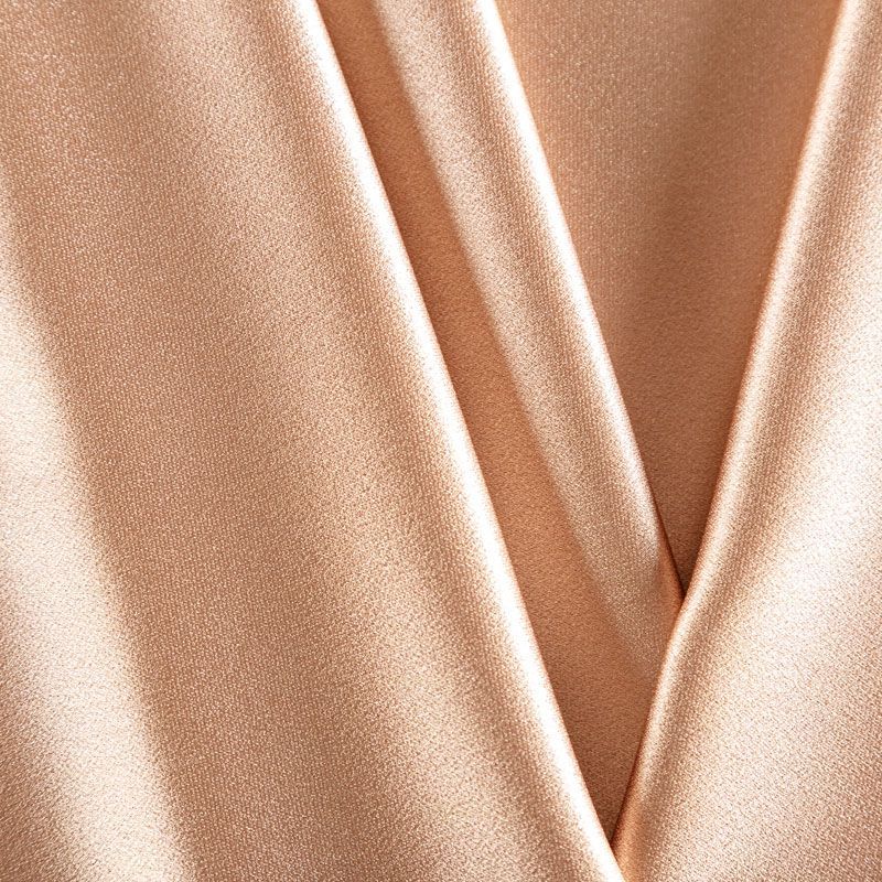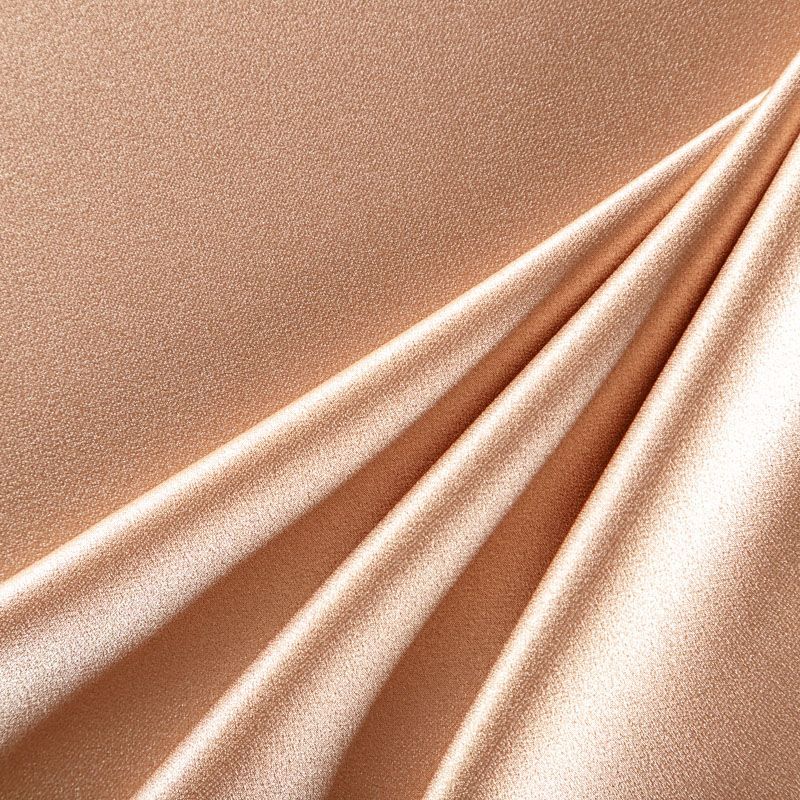 Итальянская ткань кади светло-коричневого оттенка. Кади — это креп-атлас с красивым глянцевым блеском. Ткань с плотной фактурой, роскошно ниспадает, очень хорошо тянется, изумительно садится по фигуре и шикарно смотрится в изделии. Она хорошо драпируется, эффектно облегает. Подходит для пошива удлиненных платьев с драпировками, платья-футляра, брюк палаццо, юбки-карандаш, жакета, туники, кроп-топа, а также для вечерних, свадебных и  выпускных платьев и костюмов.