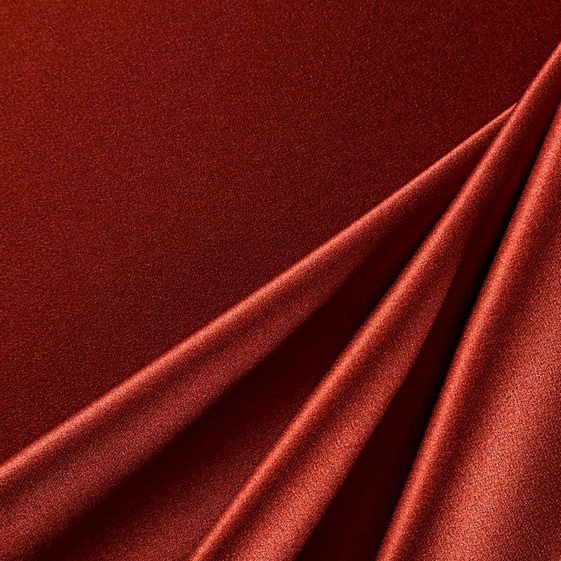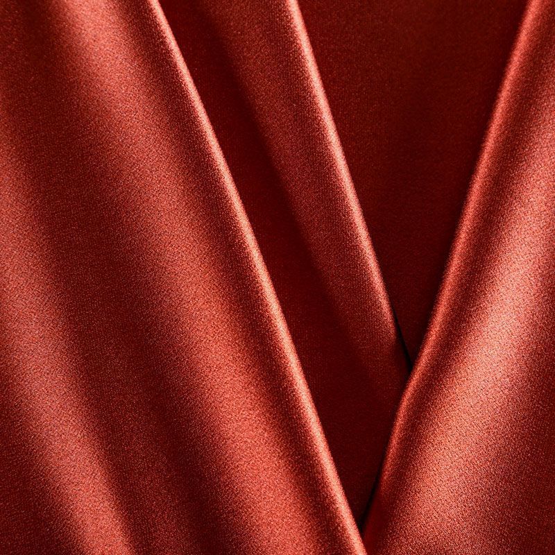 Итальянская ткань кади терракотового оттенка. Кади — это креп-атлас с красивым глянцевым блеском. Ткань с плотной фактурой, роскошно ниспадает, очень хорошо тянется, изумительно садится по фигуре и шикарно смотрится в изделии. Она хорошо драпируется, эффектно облегает. Подходит для пошива удлиненных платьев с драпировками, платья-футляра, брюк палаццо, юбки-карандаш, жакета, туники, кроп-топа, а также для вечерних, свадебных и  выпускных платьев и костюмов.
