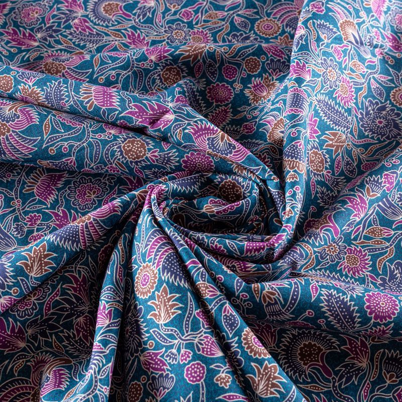 Плательно-рубашечный натуральный хлопок со стилизованным растительным принтом в синих, розовых и коричневых тонах на сложном сине-зеленом фоне. Ткань имеет плотное переплетение, матовую гладкую поверхность, хорошо держит форму, не прозрачная. Подойдет для пошива рубашек, платья-рубашки, юбки, сарафана, туники, домашней одежды.