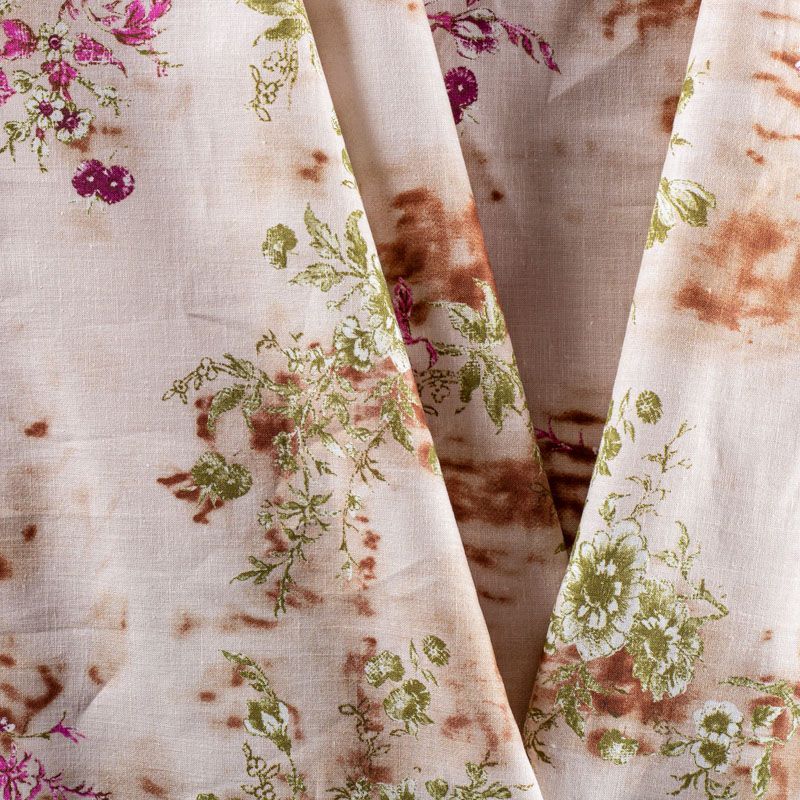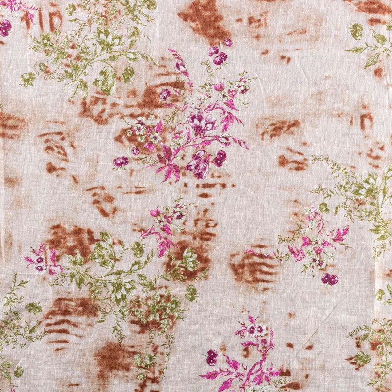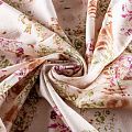 Плательно-рубашечный натуральный хлопок с цветочным узором в розово-зеленых тонах на  бежевом фоне, напоминащем кору березы. Ткань имеет плотное переплетение, матовую гладкую поверхность, хорошо держит форму, не прозрачная. Подойдет для пошива рубашек, платья-рубашки, юбки, сарафана, туники, домашней одежды.
