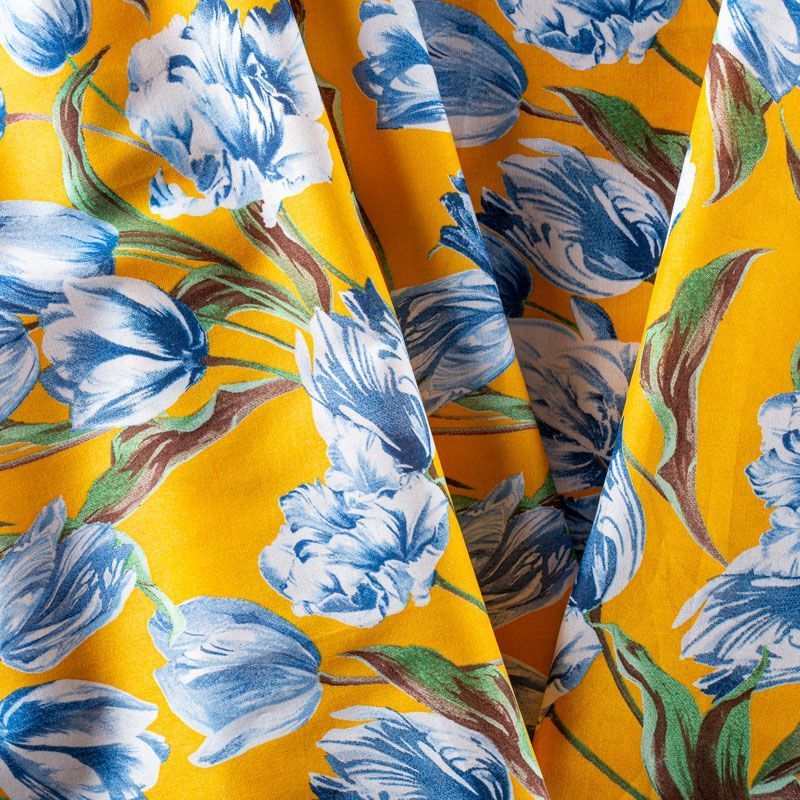 Плательно-рубашечный натуральный хлопок с крупным цветочным принтом в  голубых оттенках на насыщенном желтом фоне. Ткань имеет плотное переплетение, матовую гладкую поверхность, хорошо держит форму, не прозрачная. Подойдет для пошива рубашек, платья-рубашки, юбки, сарафана, туники, домашней одежды.