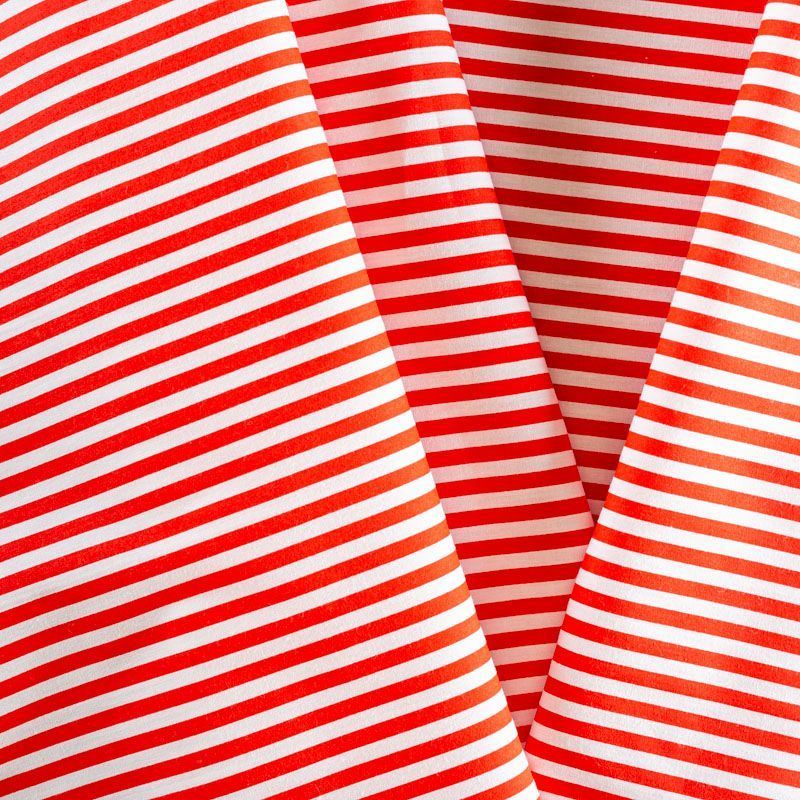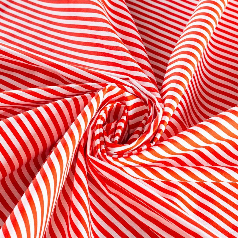 Плательно-блузочная ткань из натурального хлопка в вертикальную красную полоску. Ткань легкая, тонкая, хорошо "дышит", мягкая, не прозрачная. Подойдет для пошива летнего платья, летящей юбки, блузы, сарафана, комбинезона или рубашки.