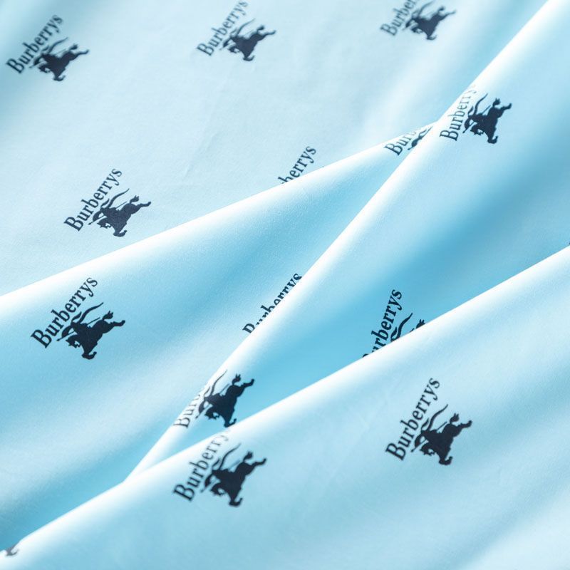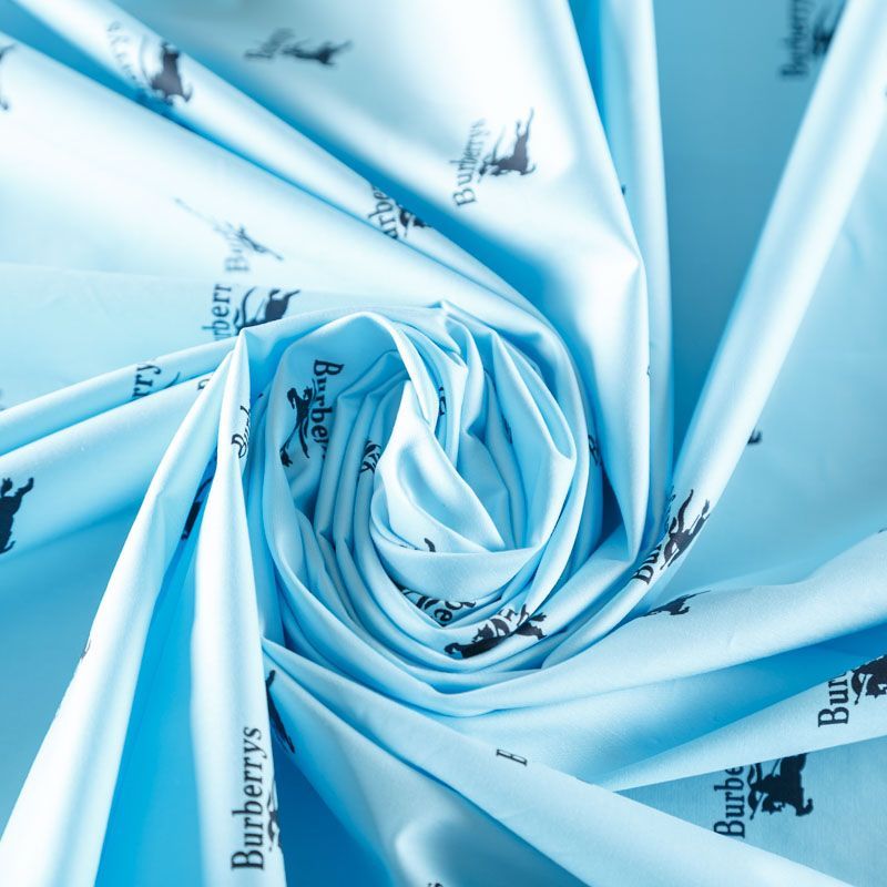 Плательно-блузочная ткань из натурального хлопка с принтом лого известного бренда в голубом оттенке. Ткань легкая, тонкая, хорошо "дышит", мягкая, тянется за счет эластана в составе. Подойдет для пошива летнего платья, летящей юбки, блузы, сарафана или рубашки.
