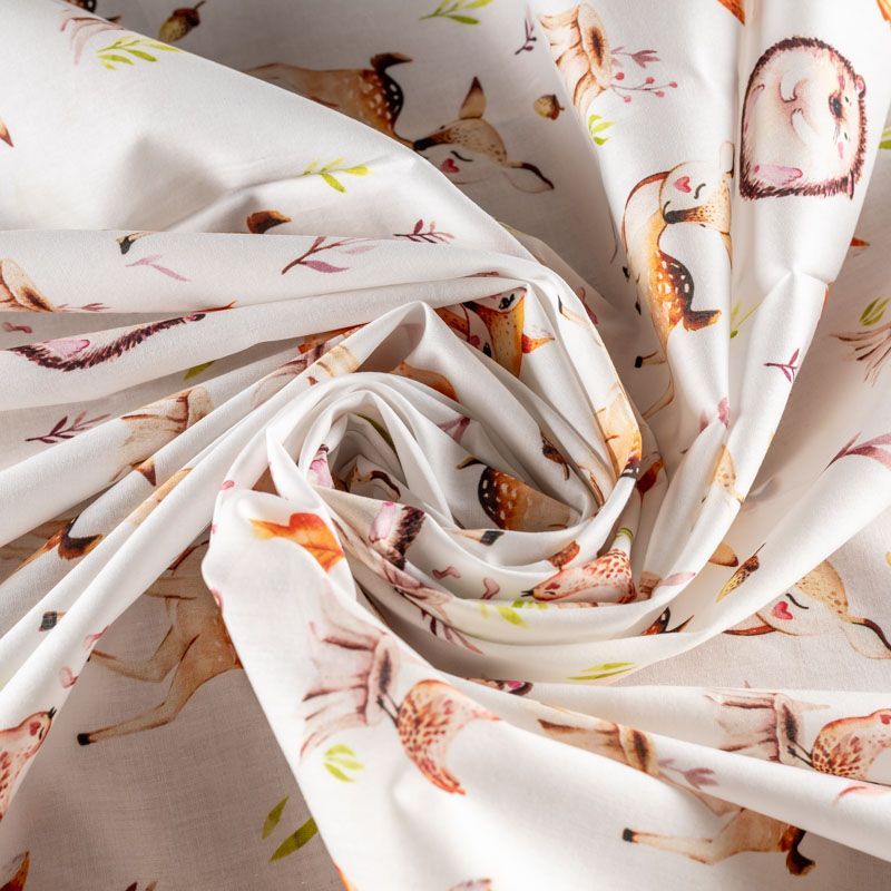 Итальянский натуральный хлопок с детским рисунком в виде лесных милых зверушек. Ткань легкая, тонкая, хорошо "дышит", мягкая, слегка прозрачная, по плотности напоминает батист. Подойдет для пошива домашней одежды, детских летних платьев, песочников, юбки, сарафана или рубашки, а также для для пошива постельных принадлежностей, подушек, покрывал, скрапбукинга, корзин и других видов творчества.