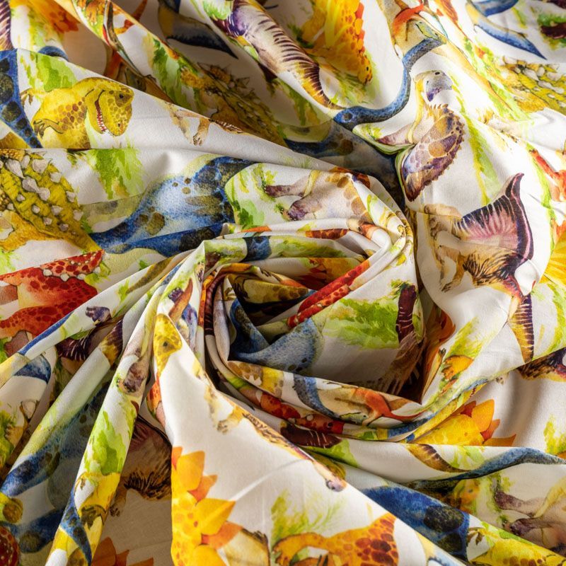 Итальянский натуральный хлопок с ярким принтом в виде милых динозавриков. Ткань легкая, тонкая, хорошо "дышит", мягкая, слегка прозрачная, по плотности напоминает батист. Подойдет для пошива домашней одежды, детских летних платьев, песочников, юбки, сарафана или рубашки, а также для для пошива постельных принадлежностей, подушек, покрывал, скрапбукинга, корзин и других видов творчества.