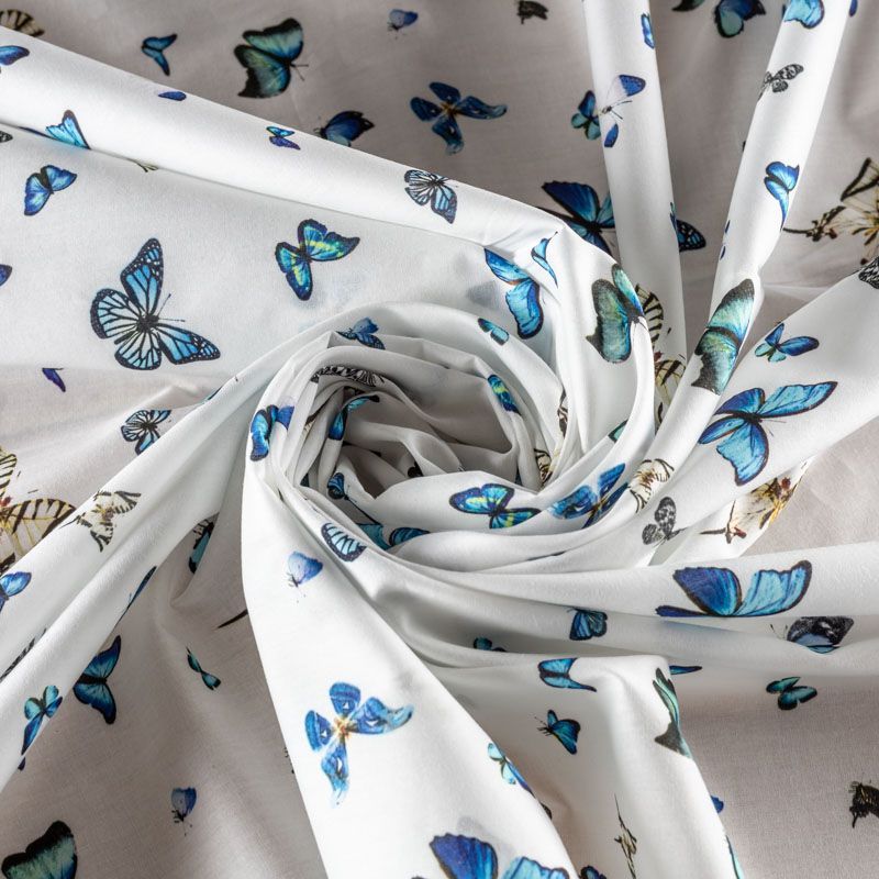 Итальянский натуральный хлопок с милым нежным рисунком в виде сине-голубых летающих бабочек. Ткань легкая, тонкая, хорошо "дышит", мягкая, слегка прозрачная, по плотности напоминает батист. Подойдет для пошива домашней одежды, детских летних платьев, песочников, юбки, сарафана или рубашки, а также для для пошива постельных принадлежностей, подушек, покрывал, скрапбукинга, корзин и других видов творчества.