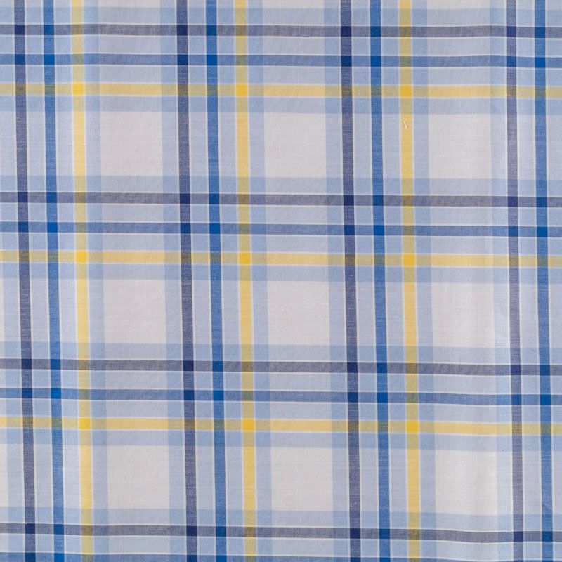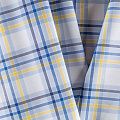 Ткань мягкая, тонкая, лёгкая, непрозрачная, поверхность матовая, приятная к телу, хорошо драпируется. По назначению - рубашечная, для юбки, платья, сарафана, туники. Сочетание полос серого, голубого, синего и желтого цветов образует красивую клетку на белом фоне.