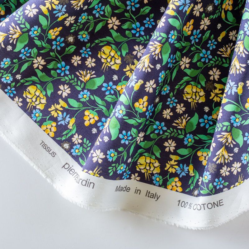 Плательно-рубашечный натуральный хлопок от французского дизайнера с мелким цветочным узором в желтых и зеленых тонах на темно-синем фоне. Ткань имеет плотное переплетение, матовую гладкую поверхность, хорошо держит форму, не прозрачная. Подойдет для пошива рубашек, платья-рубашки, юбки, сарафана, туники, домашней одежды.