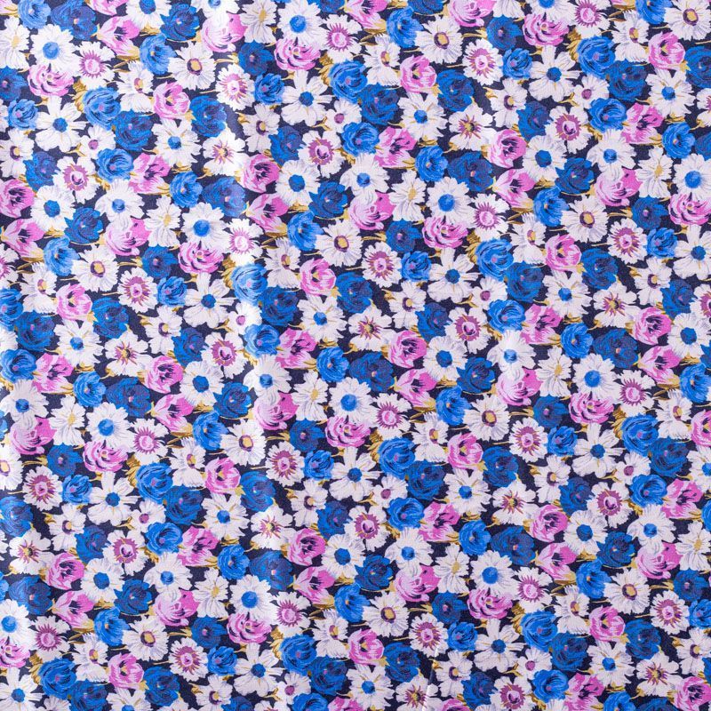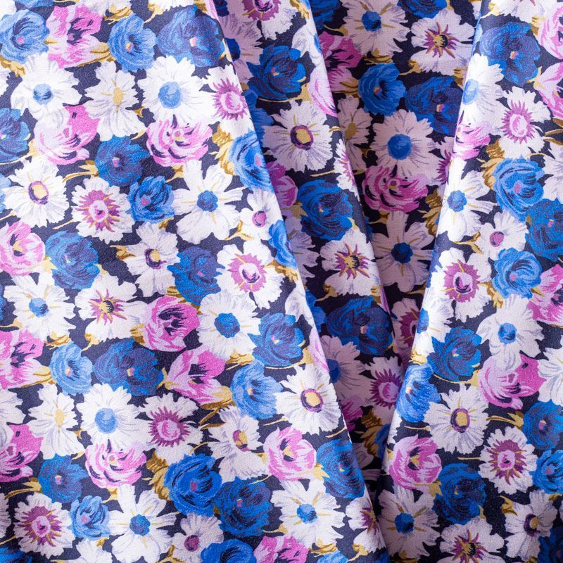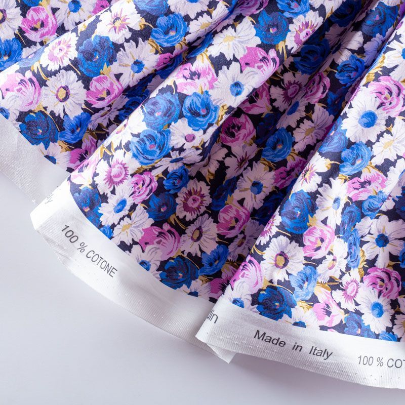 Плательно-рубашечный натуральный хлопок от французского дизайнера с мелким цветочным узором в белых, синих и розовых тонах на черном фоне. Ткань имеет плотное переплетение, матовую гладкую поверхность, хорошо держит форму, не прозрачная. Подойдет для пошива рубашек, платья-рубашки, юбки, сарафана, туники, домашней одежды.