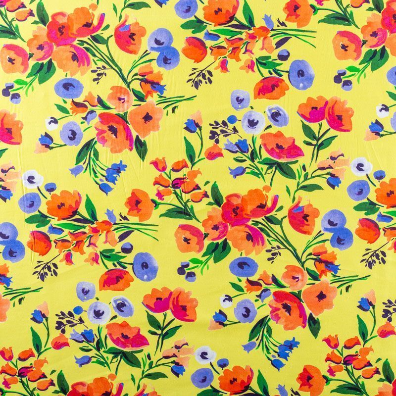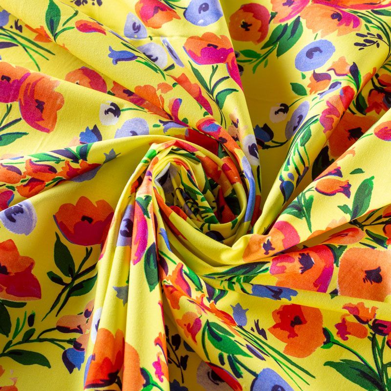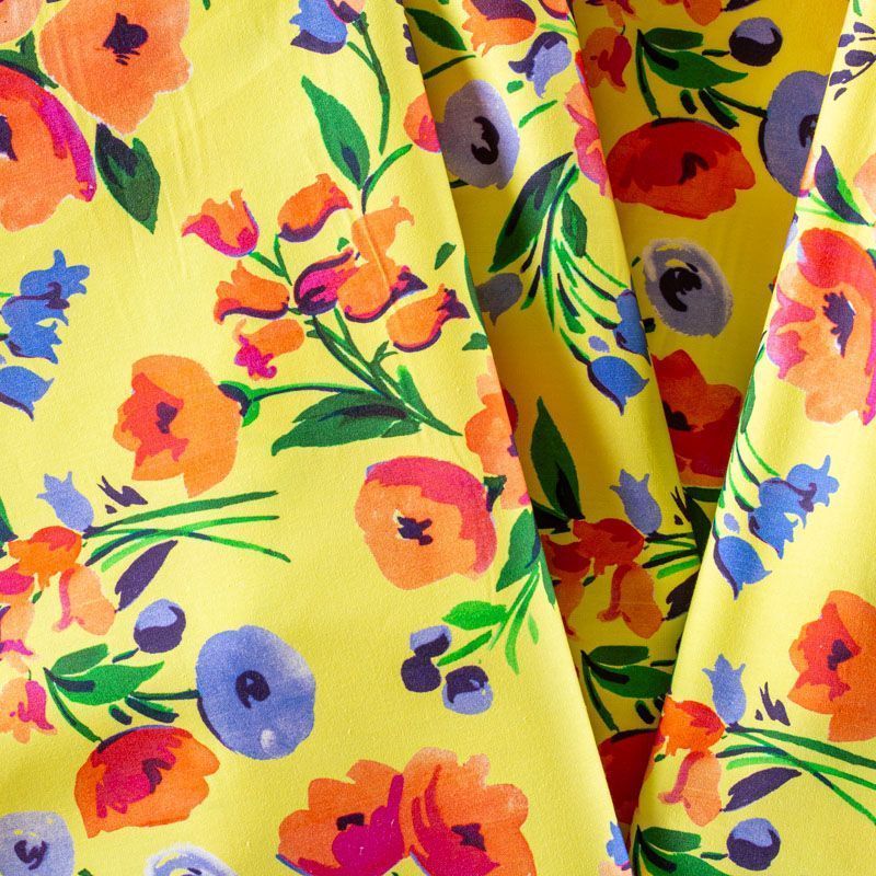 Плательно-рубашечный натуральный хлопок от французского дизайнера с акварельным цветочным принтом на желтом фоне. Ткань имеет плотное переплетение, матовую гладкую поверхность, хорошо держит форму, не прозрачная. Подойдет для пошива рубашек, платья-рубашки, юбки, сарафана, туники, домашней одежды.