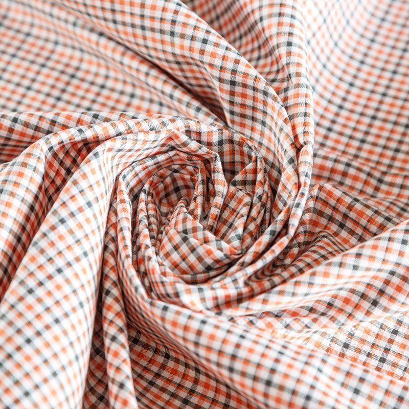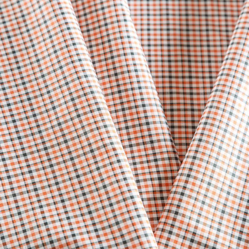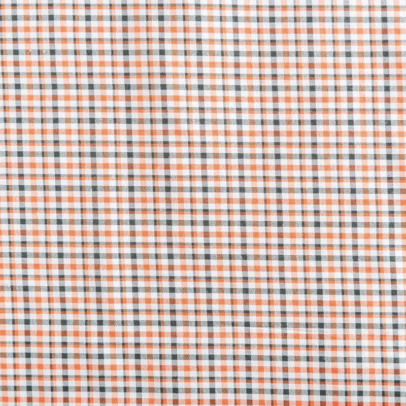 Плательно-рубашечный хлопок в белого цвета в серо-оранжевую клетку. Ткань мягкая, лёгкая, непрозрачная, пластичная и приятная к телу, хорошо драпируется, имеет гладкую матовую поверхность и сатиновое плетение. Прекрасно подойдет как для пошива платья-рубашки, сарафана, платьев различных фасонов, туники, топа, летнего костюма, комбинезона, мужкой и детской одежды.