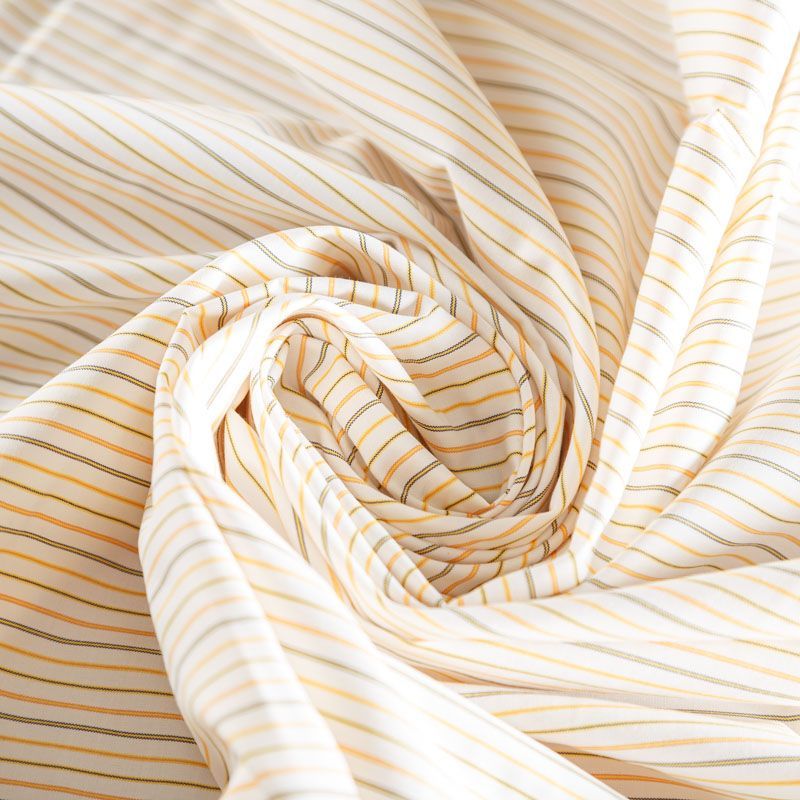 Плательно-рубашечный хлопок в белого цвета в желто-серую полоску. Ткань мягкая, лёгкая, непрозрачная, пластичная и приятная к телу, хорошо драпируется, имеет гладкую матовую поверхность и сатиновое плетение. Прекрасно подойдет как для пошива платья-рубашки, сарафана, платьев различных фасонов, туники, топа, летнего костюма, комбинезона, мужкой и детской одежды.