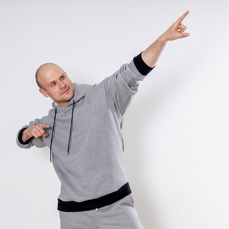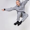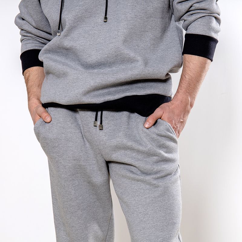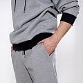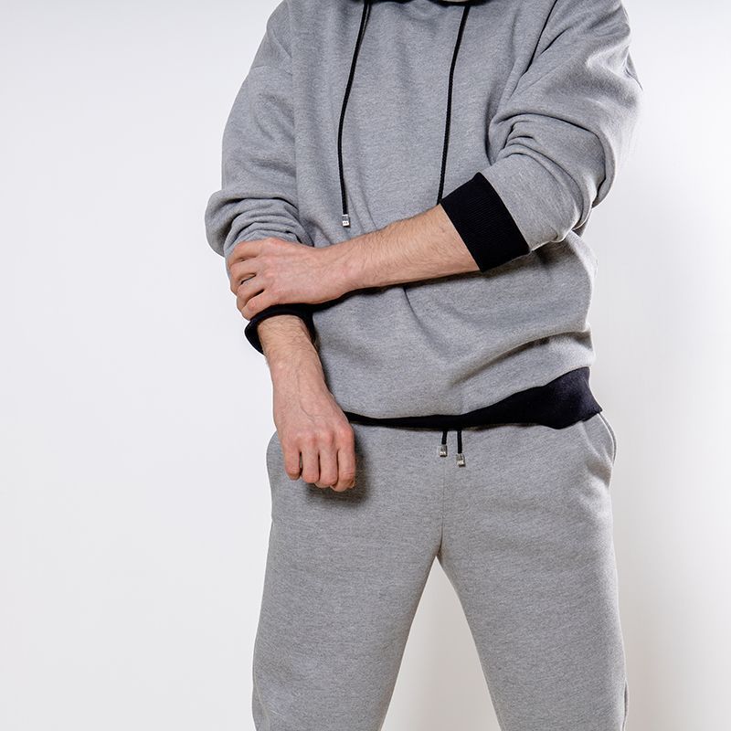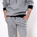Мужской костюм из 3-х ниточного футера с начесом серого цвета. Комплект состоит из худи и штанов. Худи с капюшоном, который фиксируется на шнурок с металлическими наконечниками. Рукава спущенные. Контрастные манжеты на рукавах, штанах и низ худи выполнены из хлопкового кашкорсе черного цвета. Штаны свободной посадки, в поясе - резинка и дополнительная фиксация на шнурок под завязку. Карманы расположены в отрезных бочках. Костюм предназначен для прогулок, активного отдыха и занятий спортом.