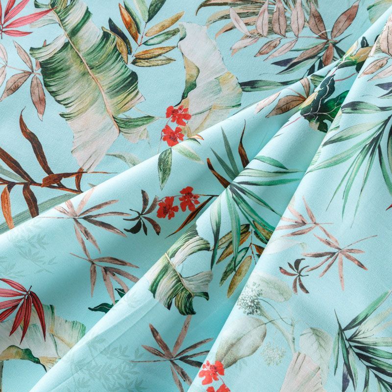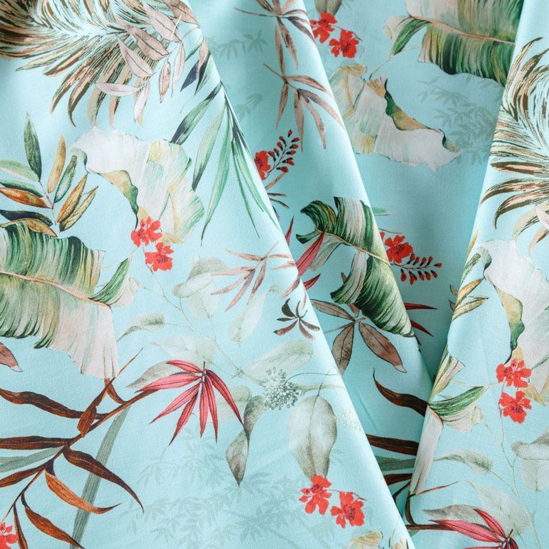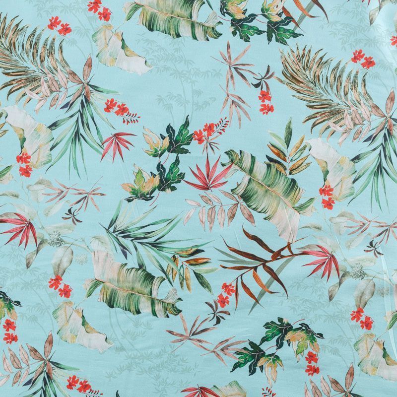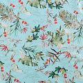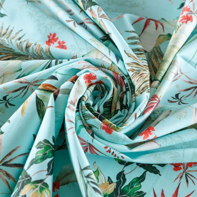 Итальянская хлопковая ткань плательной плотности в мятно-бирюзовом оттенке с тропическим принтом. Мягкая, приятная на ощупь, эластичная, держит форму, смотрится красиво, женственно. Подойдет для пошива костюма, легкого жакета, летней куртки, юбки, шорт, платья и других изделий.