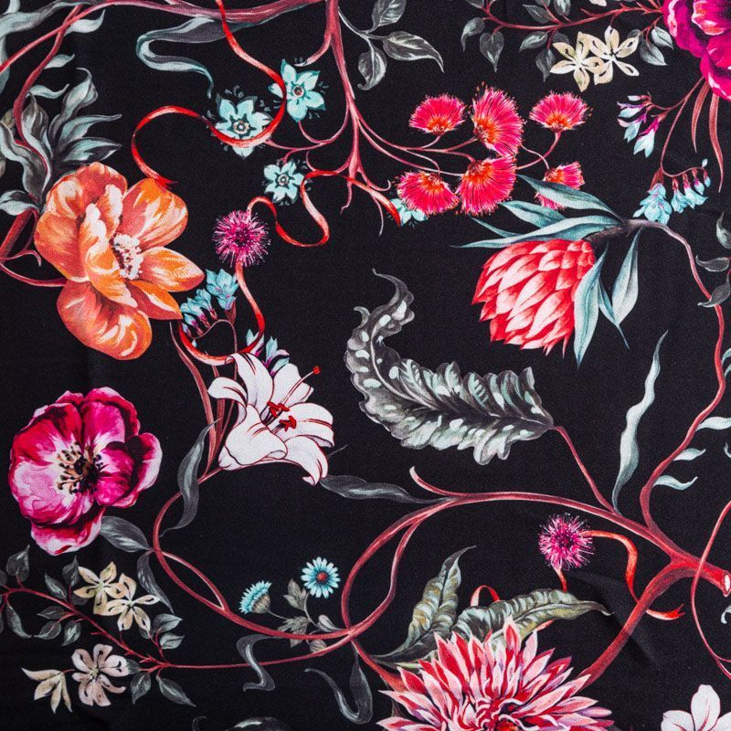 Итальянский смесовый креп плательной плотности глубокого черного цвета с красивым цветочным принтом. Поверхность матовая и фактурная, ткань малосминаемая, тянется за счет эластана в составе, красиво драпируется, струится и дает объемную складку, не просвечивает.Идеально подойдет для шикарного платья, блузы, юбки, комбинезона, брюк свободного кроя.