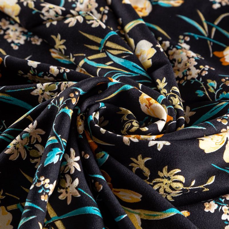 Итальянский вискозный креп плательной плотности глубокого черного цвета с красивым цветочным принтом. Поверхность матовая и фактурная, ткань малосминаемая, тянется за счет эластана в составе, красиво драпируется, струится и дает объемную складку, не просвечивает.Идеально подойдет для шикарного платья, блузы, юбки, комбинезона, брюк свободного кроя.