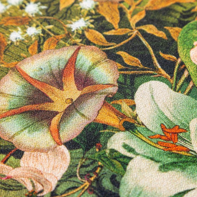 Итальянский креп плательной плотности зеленого оттенка хаки с фантазийным цветочным принтом. Поверхность матовая и фактурная, ткань малосминаемая, тянется за счет эластана в составе, красиво драпируется, струится и дает объемную складку, не просвечивает.Идеально подойдет для шикарного платья, блузы, юбки, комбинезона, брюк свободного кроя.