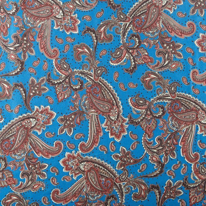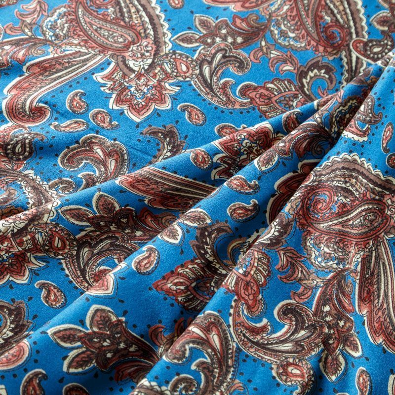 Плательный вискозный креп с узором пейсли на сине-голубом фоне. Материал приятный и комфортный в носке, не мнется и не прозрачен на свету, имеет мелкозернистую матовую поверхность. Идеально подойдет для пошива платья, юбки, широких брюк, комбинезона, блузки, топа или туники.