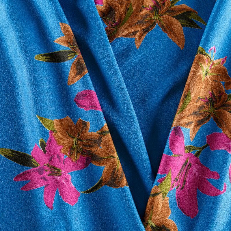 Плательно-блузочный вискозный креп синего оттенка с крупным цветочным принтом. Ткань средней плотности, имеет зернистую фактуру и матовую поверхность, не просвечивает, пластичная, хорошо драпируется мягкими складками, струится. Подходит для пошива платья и сарафана, юбки, блузки, туники, топа, комбинезона.