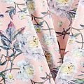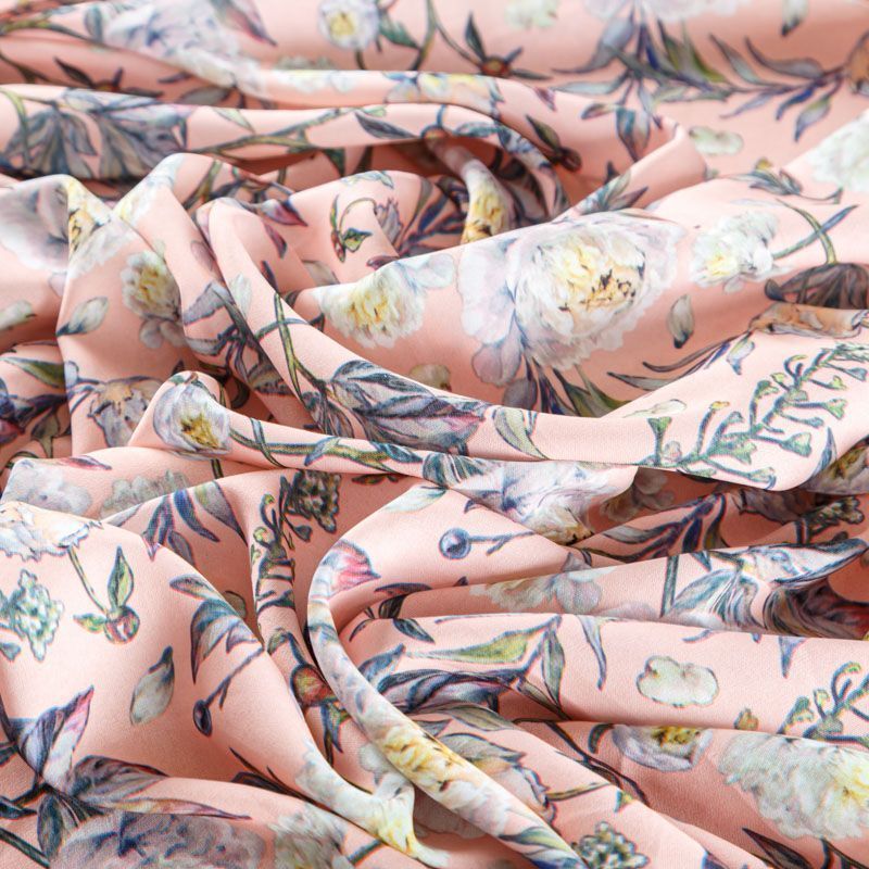 Ткань плательной плотности с флористическим принтом в приглущенных пастельных оттенках. Материал почти мнется и немного прозрачен на свету, имеет креповую фактуру, легкий, хорошо тянется, драпируется струящимися складками, приятный и комфортный в носке. Идеально подходит для пошива  платьев, юбок, блуз, комбинезонов.