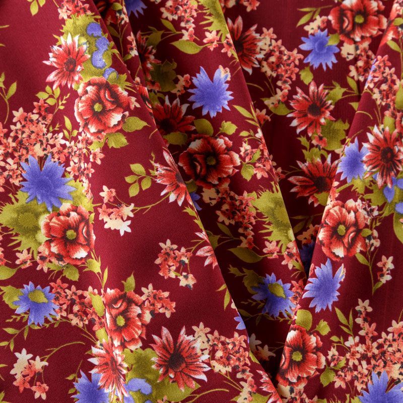 Плательный креп с цветочным принтом. Ткань средней плотности, не толстая, пластичная, поверхность полотна матовая, с характерной мелкозернистой фактурой, прочная, практически не мнется, хорошо драпируется. Превосходно подойдет для пошива стильного костюма, юбки, платья, комбинезона, топа, брюк.