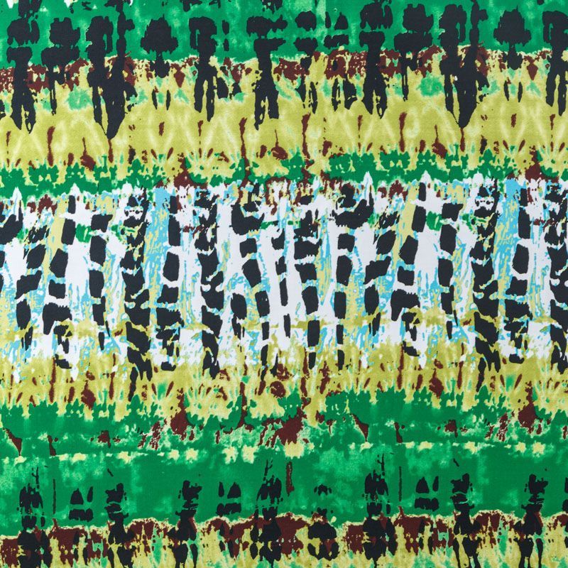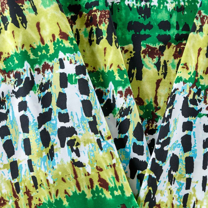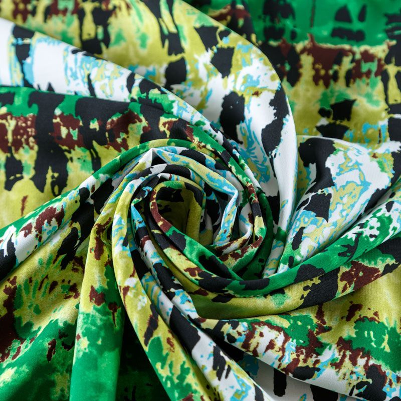 Плательный креп с абстрактным принтом. Ткань средней плотности, не толстая, пластичная, поверхность полотна матовая, с характерной мелкозернистой фактурой, прочная, практически не мнется, хорошо драпируется. Превосходно подойдет для пошива стильного костюма, юбки, платья, комбинезона, топа, брюк.
