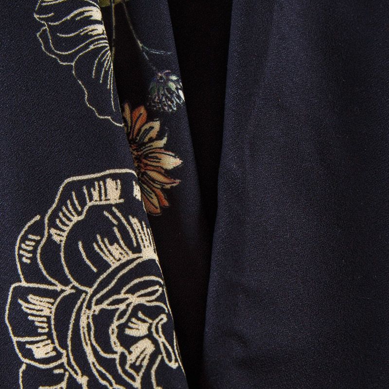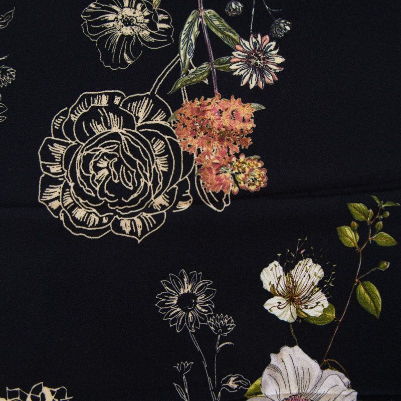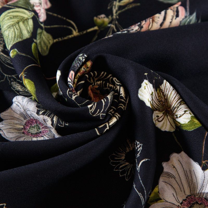 Итальянская натуральная вискозная ткань черного оттенка с растительным принтом. Ткань легкая, драпируется струящимися складками, приятная и комфортная в носке. Материал слегка мнется, имеет креповую фактуру. Идеально подходит для пошива  платьев, юбок, блуз, комбинезонов, костюмов, туник, кардиганов.