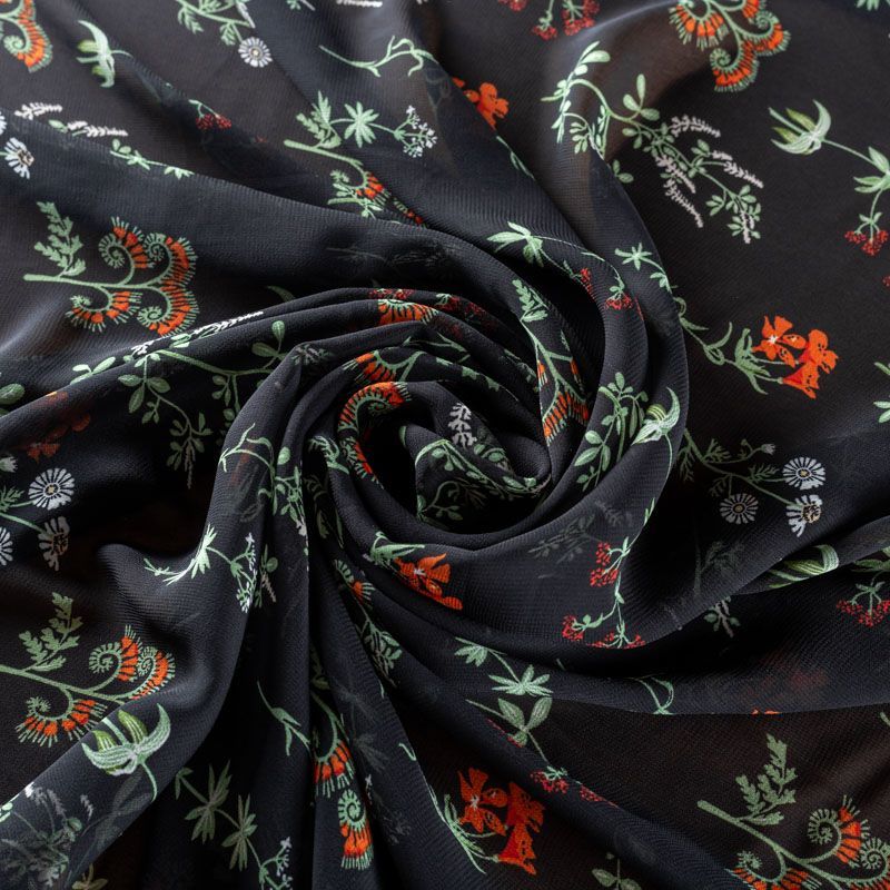Легкий, воздушный, мягкий и нежный креп-шифон, прекрасно драпируется, приятен к телу, полупрозрачный, может потребоваться подклад. Поверхность матовая, без блеска, фактурная. Идеален для нежных платьев летящих силуэтов, топов, туник, блузок, юбок с роскошными драпировками и воланами.