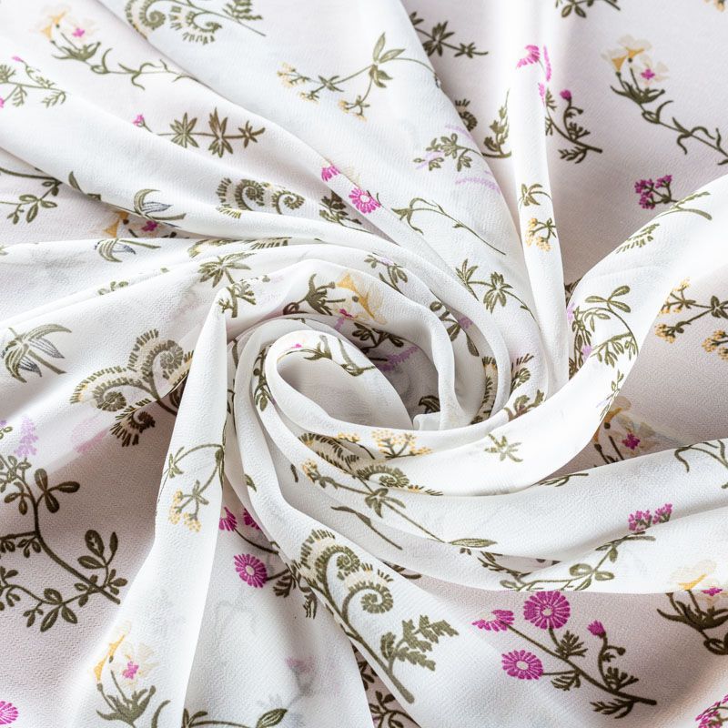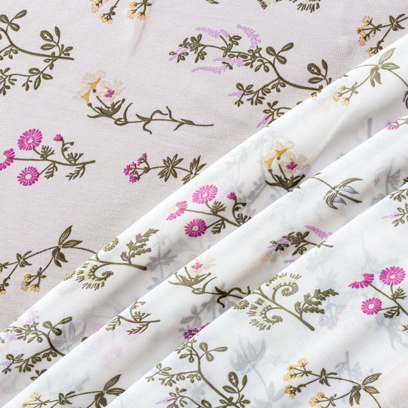 Легкий, воздушный, мягкий и нежный креп-шифон, прекрасно драпируется, приятен к телу, полупрозрачный, может потребоваться подклад. Поверхность матовая, без блеска, фактурная. Идеален для нежных платьев летящих силуэтов, топов, туник, блузок, юбок с роскошными драпировками и воланами.