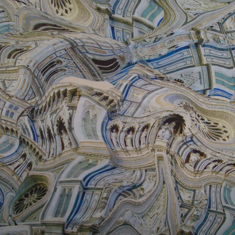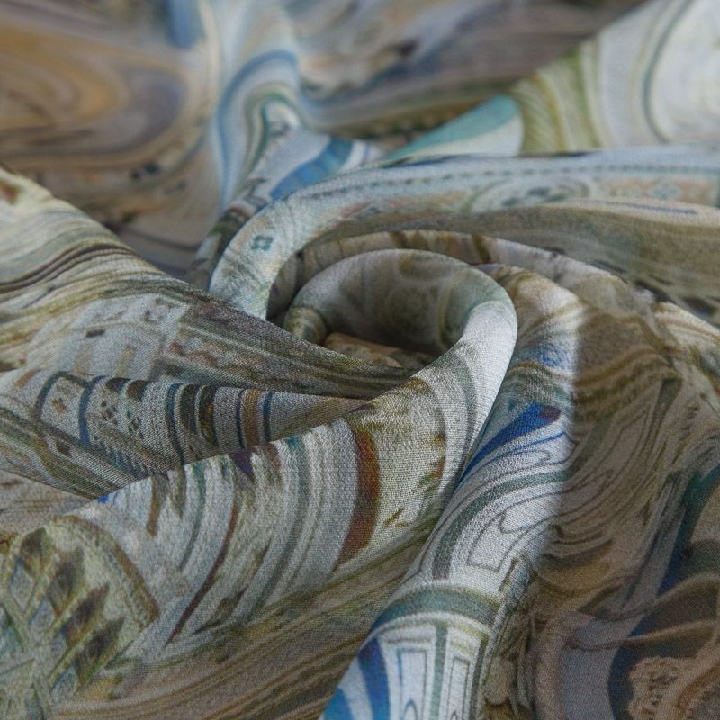 Итальянский вискозный креп-шифон с абстрактным принтом это тонкая, невероятно легкая полупрозрачная ткань полотняного переплетения с матовой поверхностью и характерной для крепа зернистой фактурой. Идеально подходит для пошива воздушных легких платьев, блуз, туник.