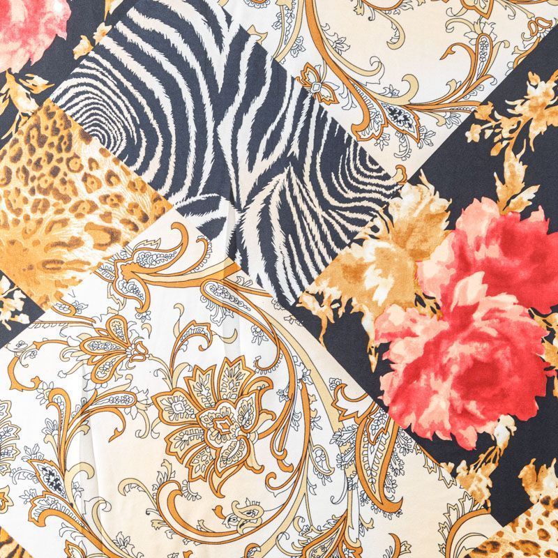 Натуральный шелковый крепдешин с матовой поверхностью, легкий, струящийся, хорошо драпируется. Оригинальный насыщенный принт выполнен в монохромной гамме в добавлением ярких цветовых акцентов. Крепдешин прекрасно подойдет для пошива летнего сарафана, платья, топа, блузки, костюма в пижамном стиле, широких брюк или юбки.