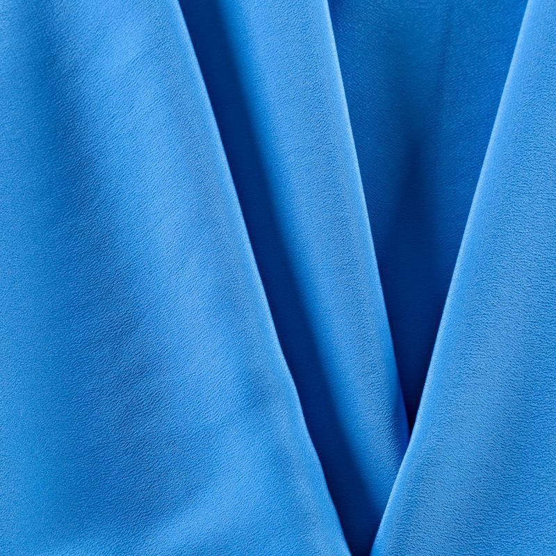 Итальянский натуральный шелковый крепдешин в голубом оттенке, фактурный, легкий и струящийся, слегка просвечивает, отлично драпируется, тянется за счет эластана в составе. Идеально подойдет для пошива платьев и сарафанов расклешенных моделей, с воланами, летящих юбок, топов, блузки, юбки, широких брюк, костюма в пижамном стиле.
