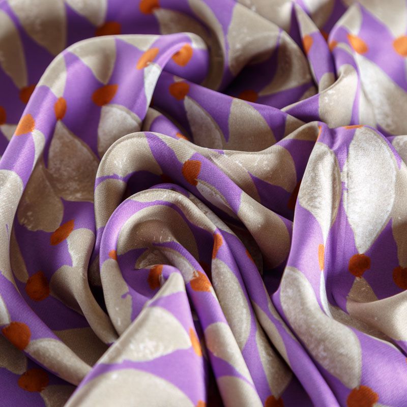 Итальянский натуральный купонный крепдешин с абстрактным принтом на фоне лавандового оттенка, тонкий, слегка прозрачный, отлично драпируется, легкий и струящийся с креповой поверхностью. Идеально подойдет для пошива платьев и сарафанов расклешенных моделей, с воланами, летящих юбок, топов, блузки, костюма в пижамном стиле.