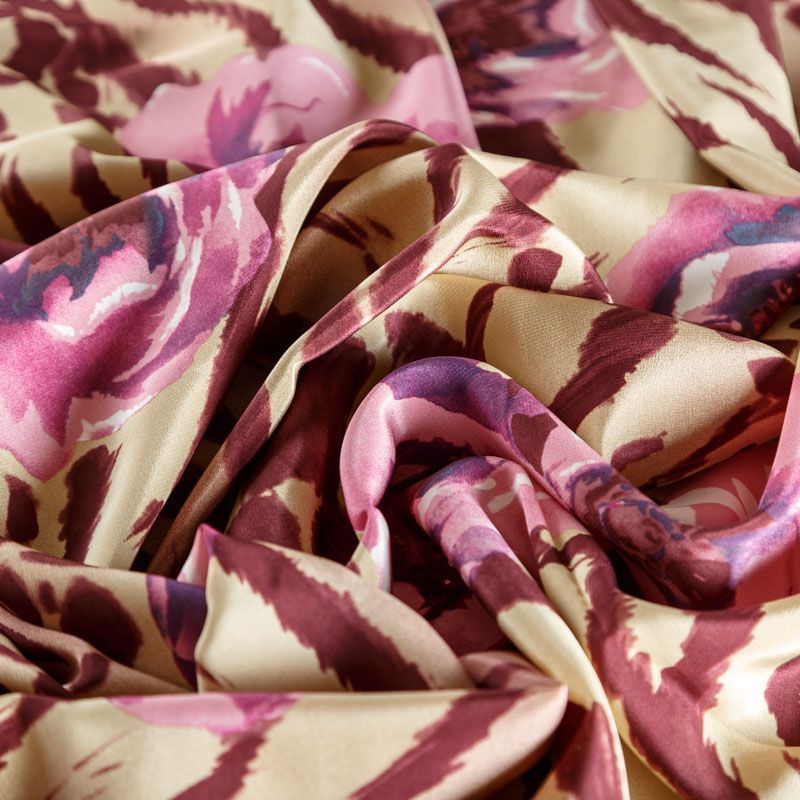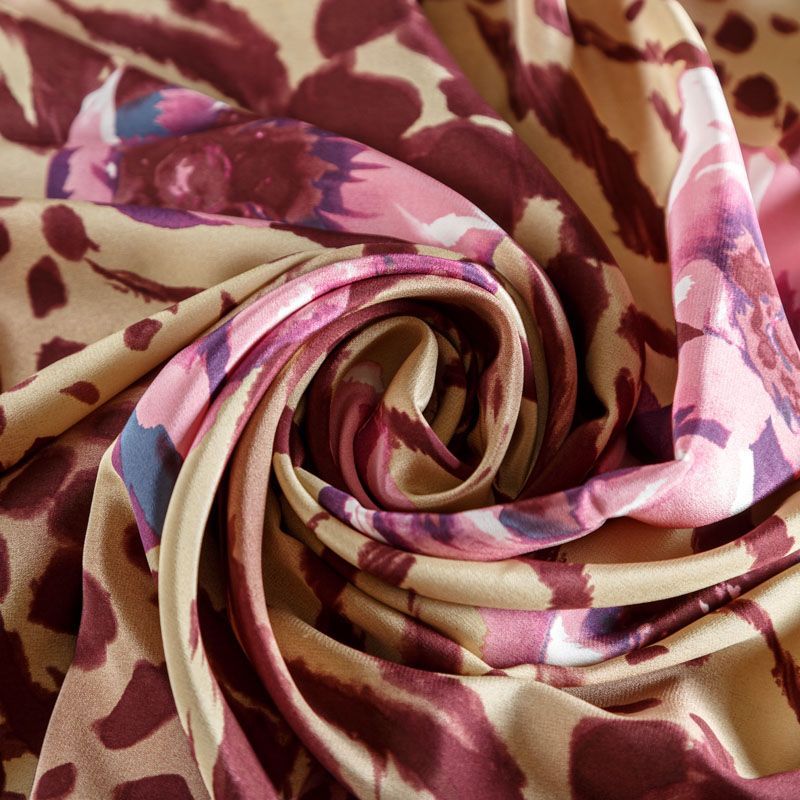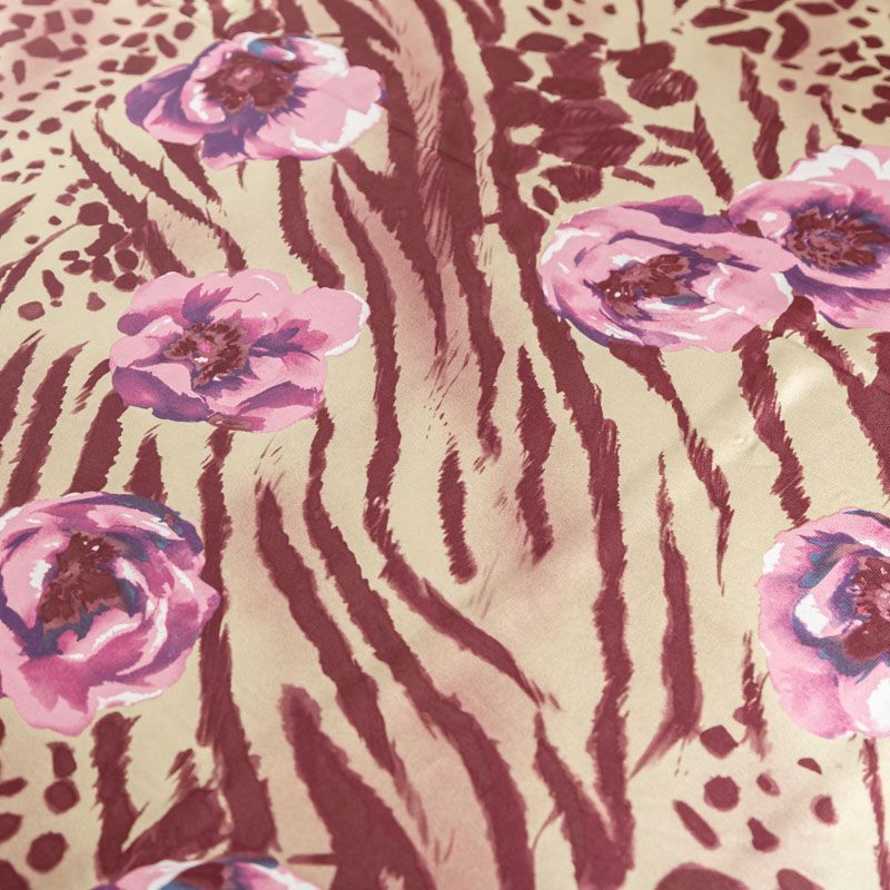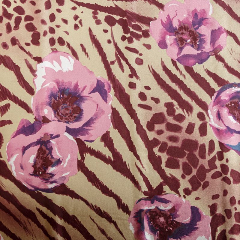 Натуральный шелковый крепдешин с матовой поверхностью, легкий, струящийся, хорошо драпируется, не просвечивает. Оригинальный принт сочетает анималистический и цветочный узоры и выполнен в приглушенном сливовом оттенке, который прекрасно подойдет для пошива летнего сарафана, платья, блузки, костюма в пижамном стиле, широких брюк или юбки.