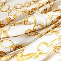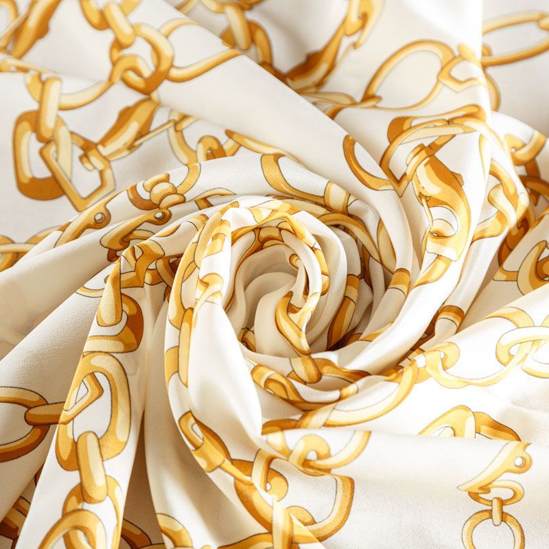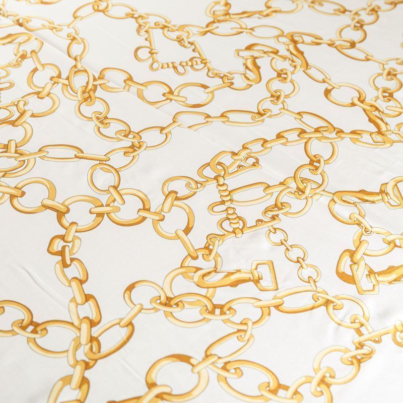 Итальянский натуральный крепдешин в молочном оттенке с золотыми цепочками, тонкий, слегка прозрачный, отлично драпируется, легкий и струящийся. Идеально подойдет для пошива платьев и сарафанов расклешенных моделей, с воланами, летящих юбок, топов, блузки, юбки, широких брюк, костюма в пижамном стиле.