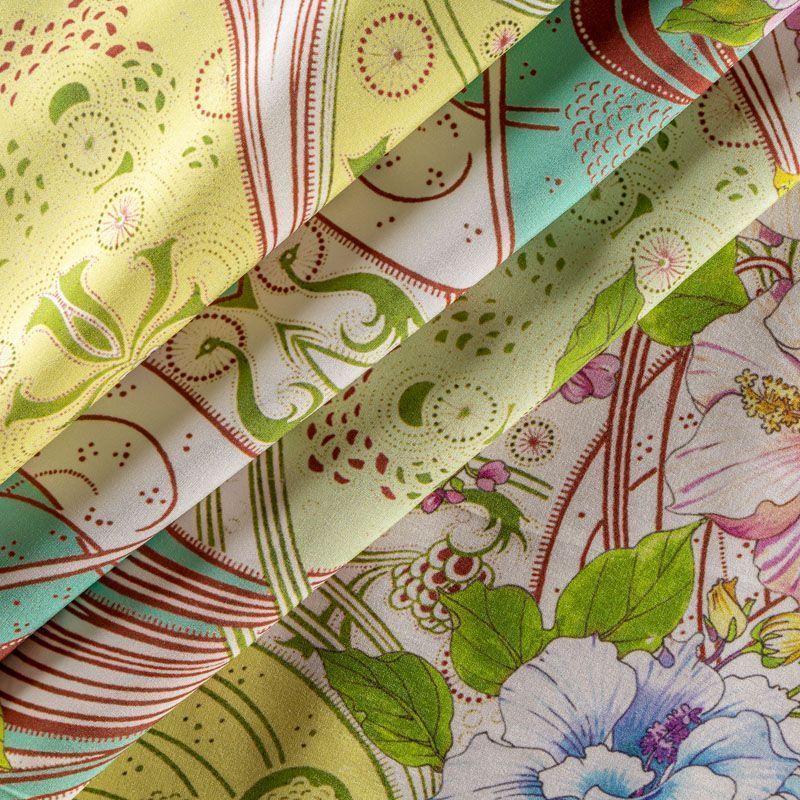Натуральный шелковый крепдешин с матовой поверхностью, легкий, струящийся, хорошо драпируется. Цветочный принт выполнен в нежных пастельных оттенках, который будет уместен для пошива летнего сарафана, платья, блузки, костюма в пижамном стиле, широких брюк или юбки.