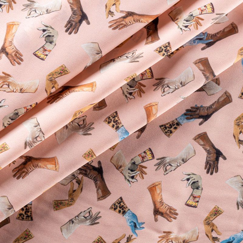 Натуральный итальянский крепдешин легкий, тонкий, воздушный и струящийся, хорошо драпируется. Современный принт выполнен в сдержанных оттенках на нежном пудровом фоне, который будет уместен для пошива летнего сарафана, платья, блузки, костюма в пижамном стиле, широких брюк или юбки.