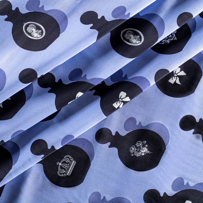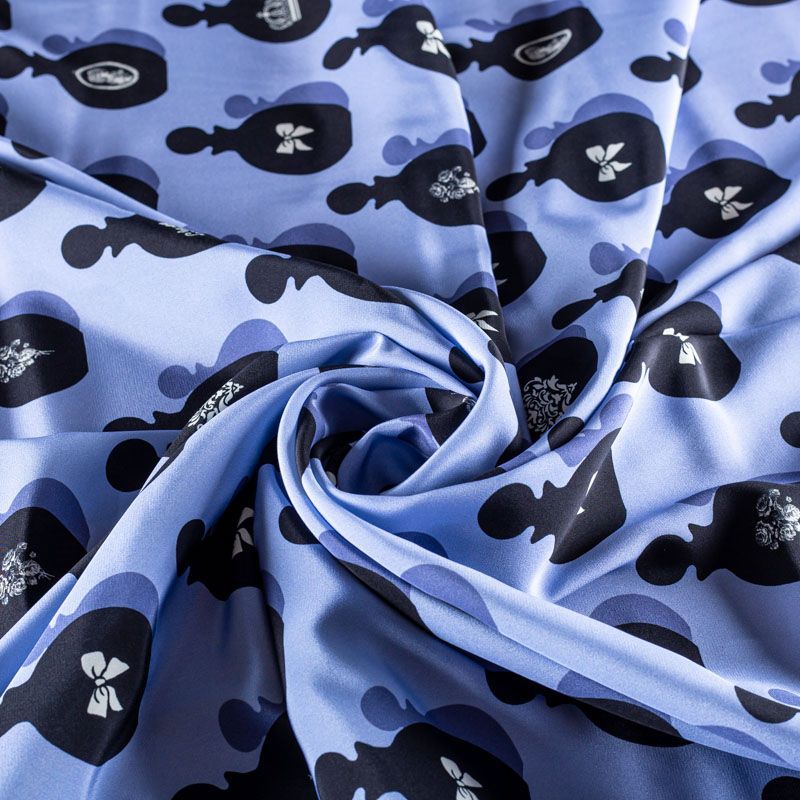Итальянский крепдешин с матовой лицевой поверхностью со стилизованными флаконами духов на лавандовом фоне, тонкий, слегка прозрачный, отлично драпируется, легкий и струящийся. Идеально подойдет для пошива платьев и сарафанов расклешенных моделей, с воланами, летящих юбок, топов, блузки, костюма в пижамном стиле.
