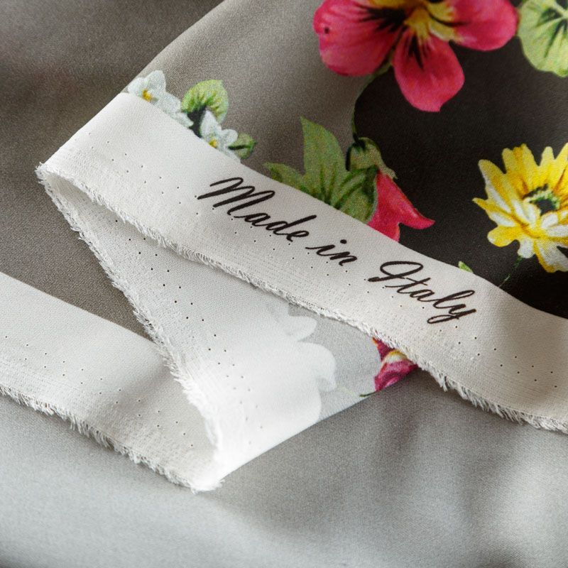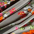Итальянский крепдешин с матовой лицевой поверхностью ярким цветочным принтом на сером фоне, тонкий, слегка прозрачный, отлично драпируется, легкий и струящийся. Идеально подойдет для пошива платьев и сарафанов расклешенных моделей, с воланами, летящих юбок, топов, блузки, костюма в пижамном стиле.