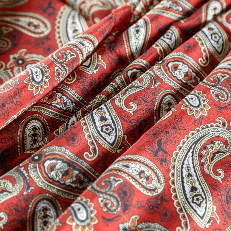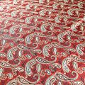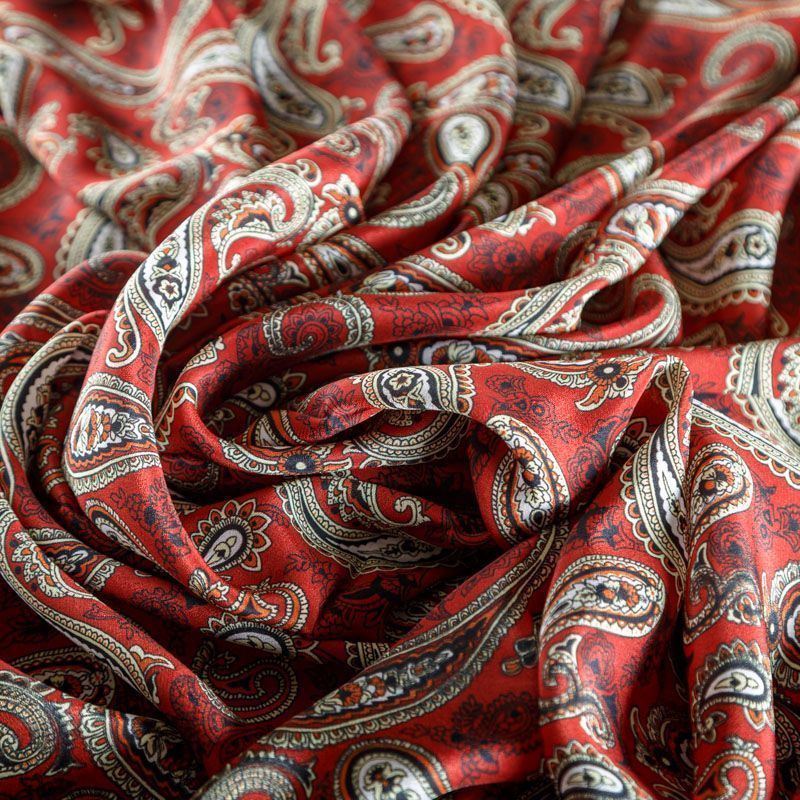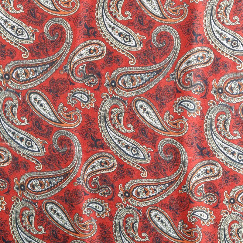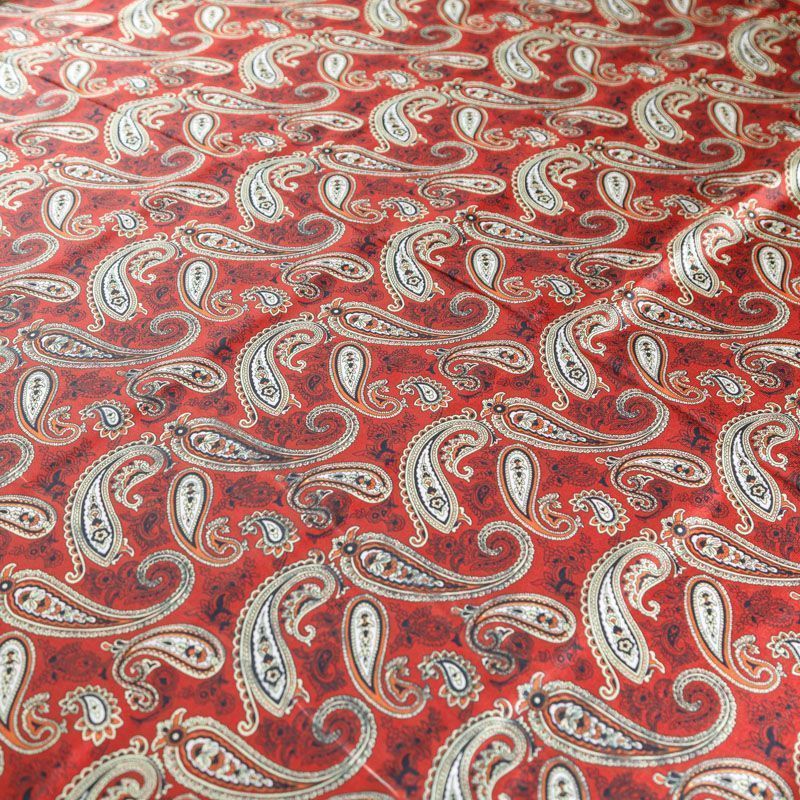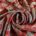 Итальянский крепдешин с матовой лицевой поверхностью темно-красного оттенка с классическим принтом пейсли, тонкий, слегка прозрачный, отлично драпируется, легкий и струящийся. Идеально подойдет для пошива платьев и сарафанов расклешенных моделей, с воланами, летящих юбок, топов, блузки, костюма в пижамном стиле.